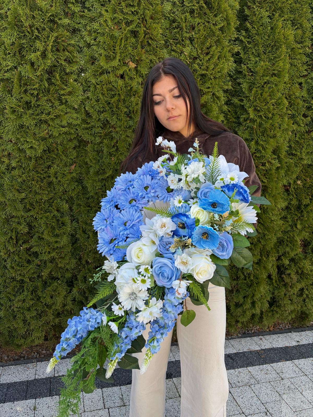 Elegancka i wyjątkowo efektowna kompozycja nagrobna wykonana z najwyższej jakości sztucznych kwiatów. Połączenie kwiatów w odcieniach błękitu i bieli oraz dekoracyjną zielenią tworzy pełną wdzięku i harmonii całość.