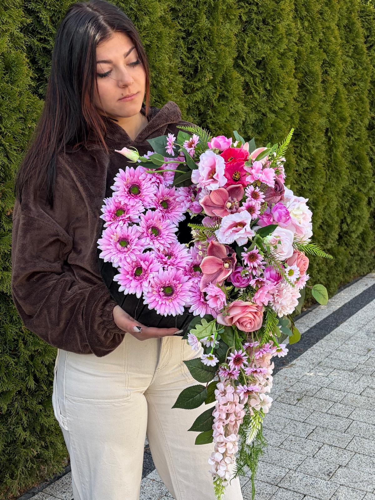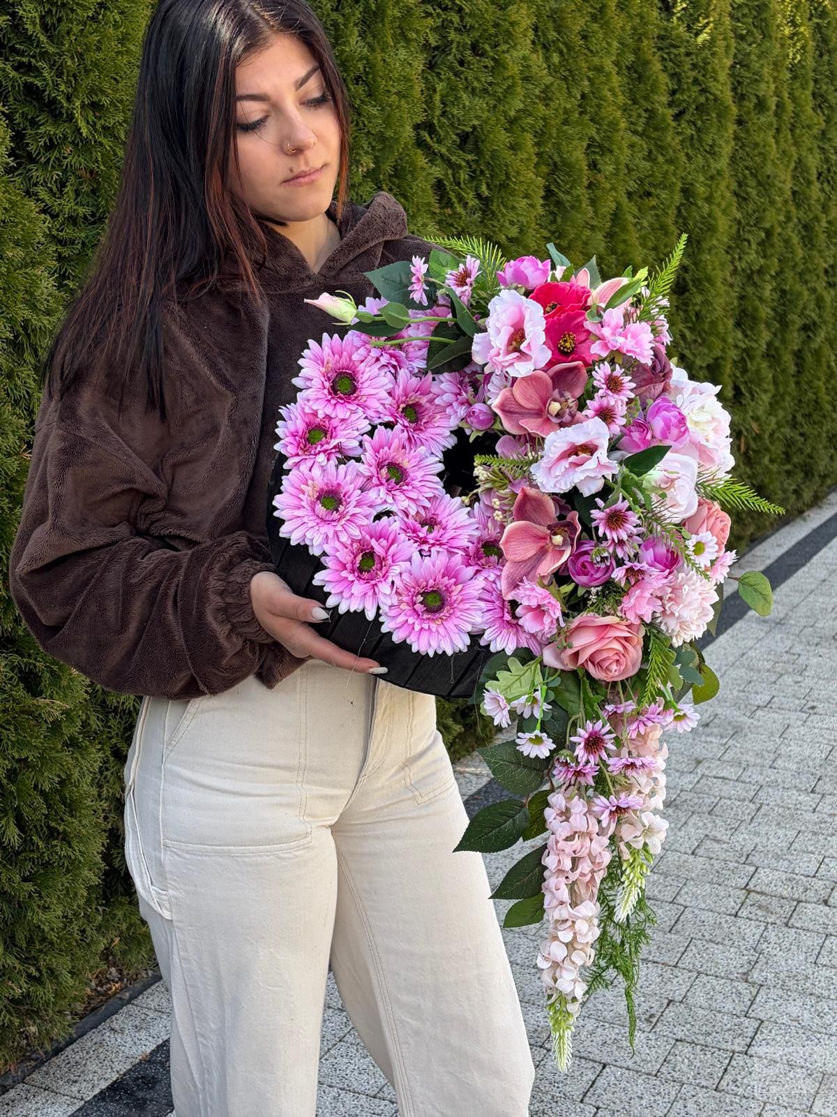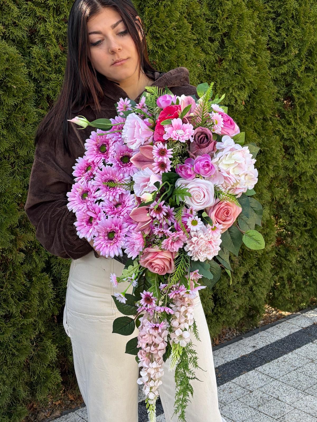 Elegancka i wyjątkowo efektowna kompozycja nagrobna wykonana z najwyższej jakości sztucznych kwiatów. Połączenie kwiatów w odcieniach różu oraz dekoracyjną zielenią tworzy pełną wdzięku i harmonii całość.