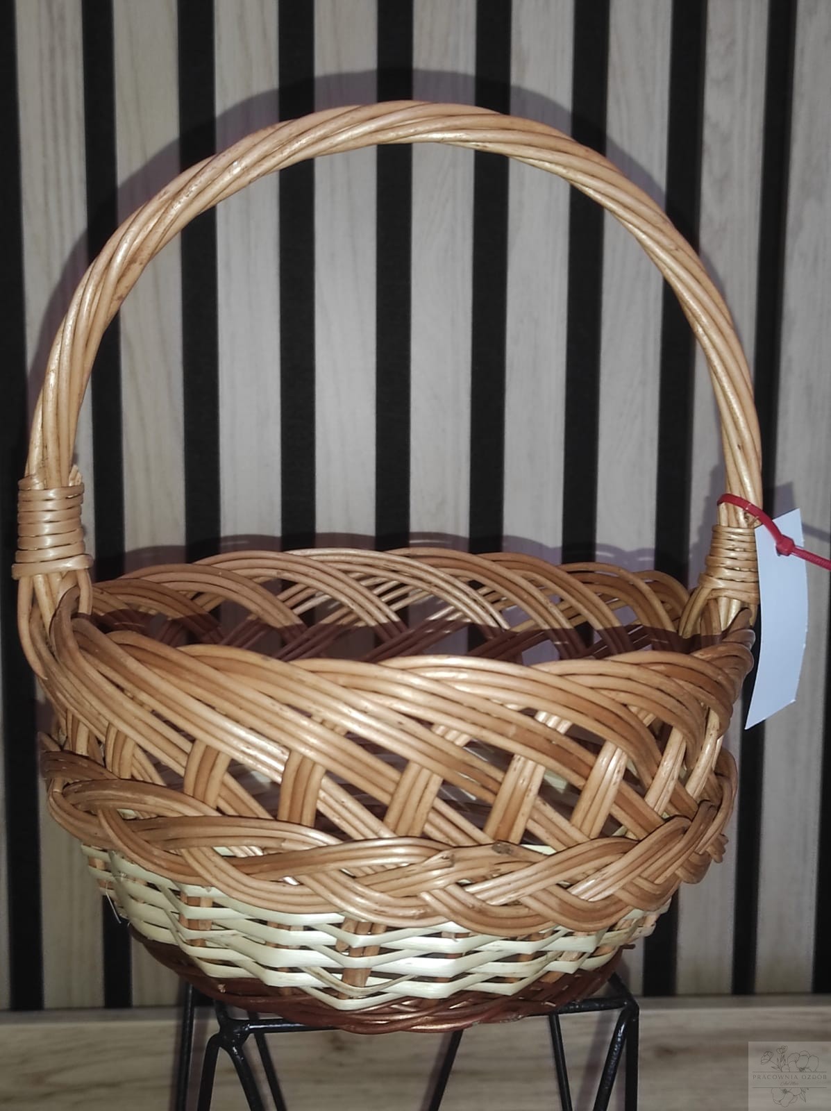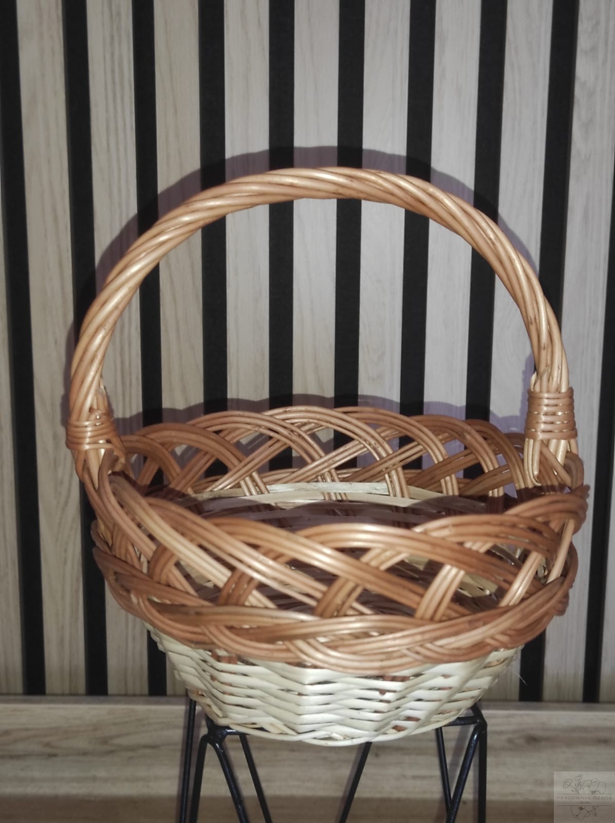 Koszyczek utrzymany jest w naturalnych, ciepłych odcieniach wikliny z jasnymi oraz ciemniejszymi akcentami, które nadają mu wyjątkowego charakteru. Wygodny, stabilny uchwyt zapewnia komfortowe przenoszenie, a pojemne wnętrze bez problemu pomieści święconkę, pisanki, babkę wielkanocną czy inne świąteczne dodatki.