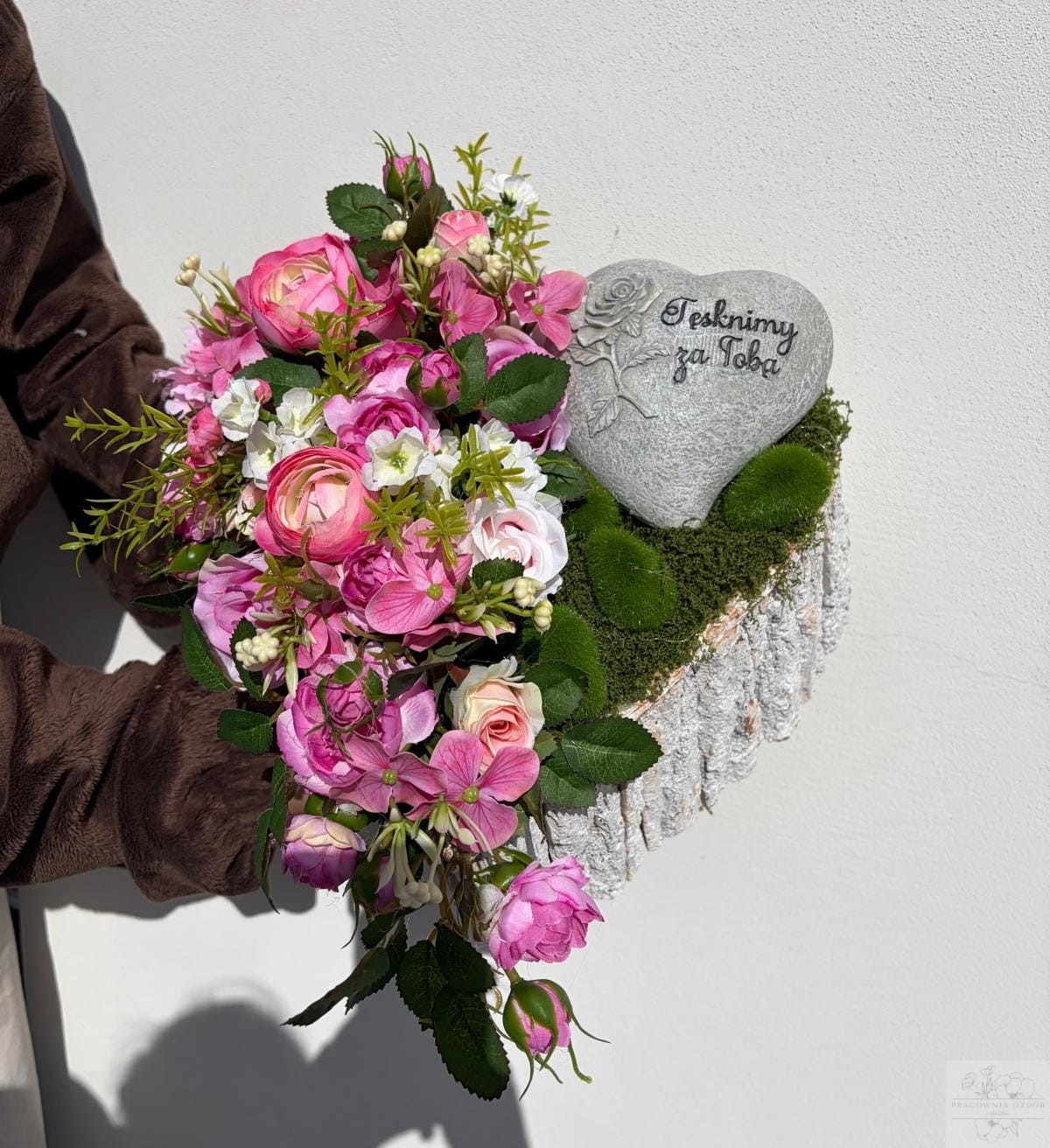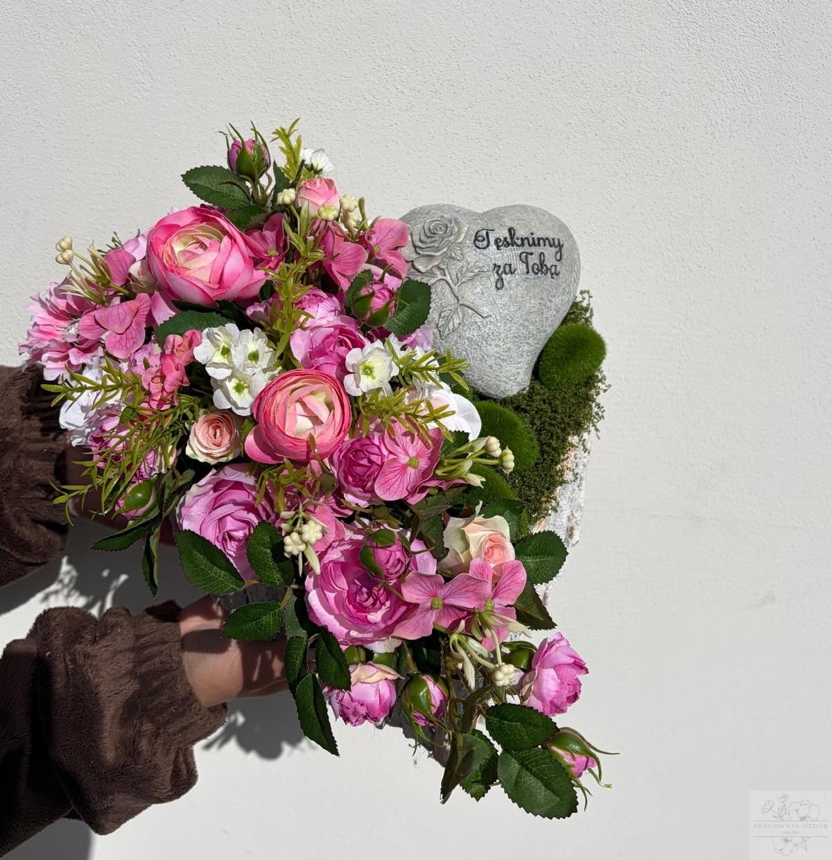 Kompozycja nagrobna w kształcie serca to wyjątkowa i pełna ciepła forma upamiętnienia, stworzona z dbałością o każdy detal.