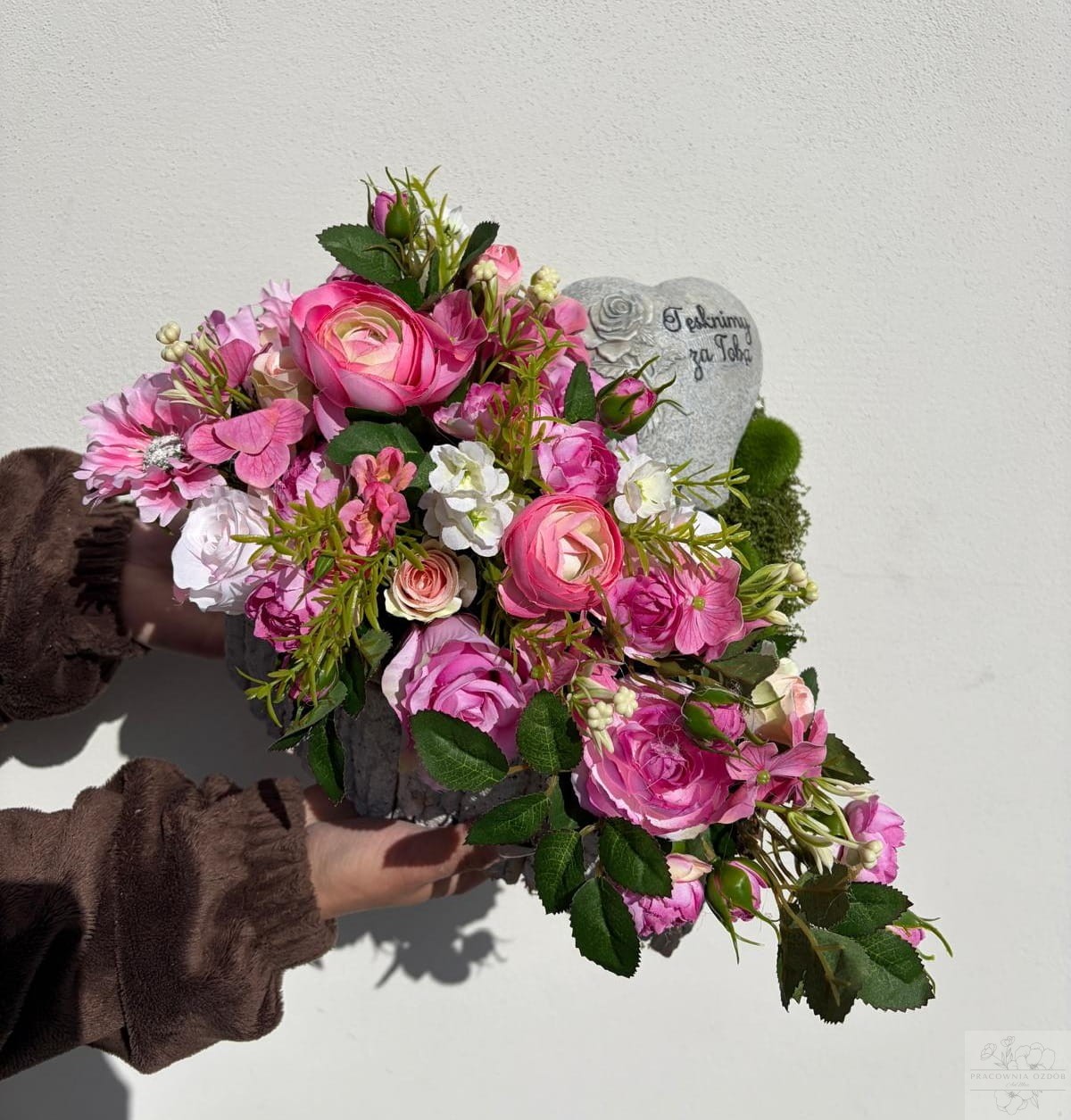 Utrzymana w delikatnej różowej kolorystyce , emanuje spokojem, subtelnością i symboliką miłości oraz pamięci. Całość osadzona jest w solidnej, dekoracyjnej podstawie w kształcie serca, która nadaje kompozycji elegancki i harmonijny wygląd. Dodatkowo kompozycje dekoruje delikatna figurka serduszka z napisem