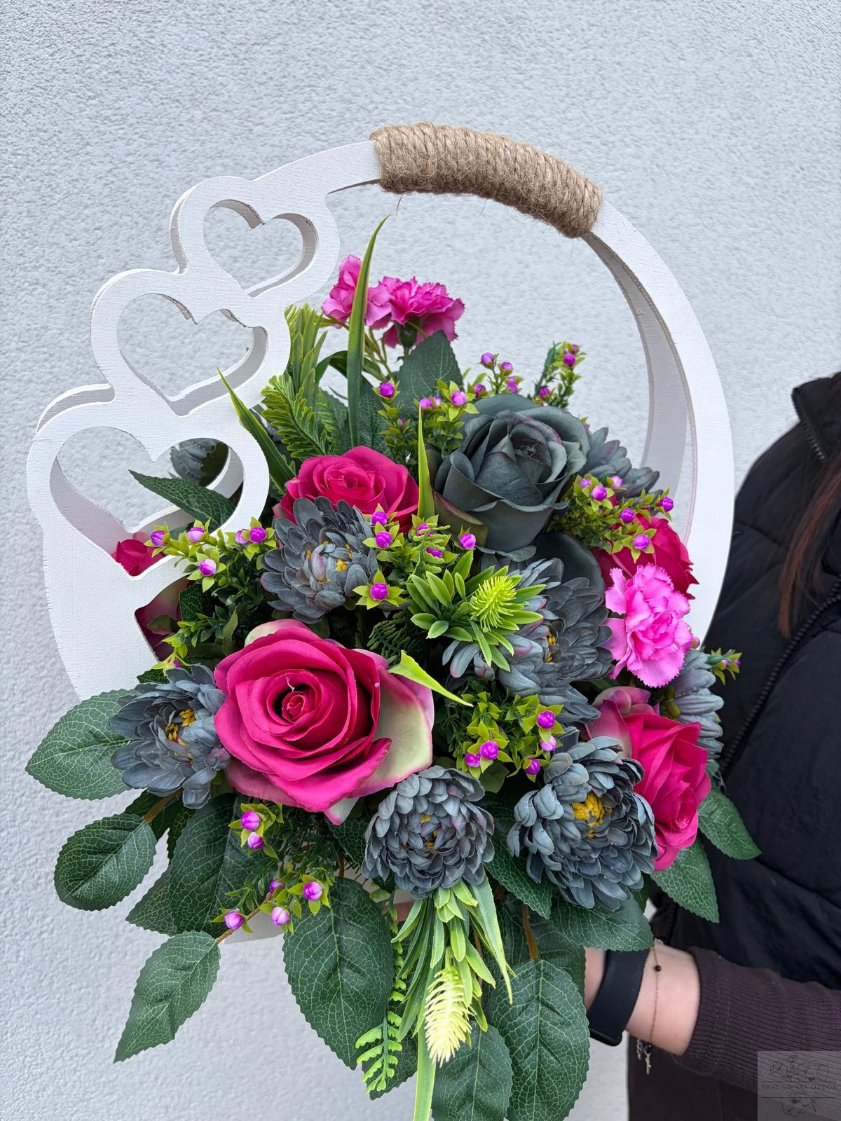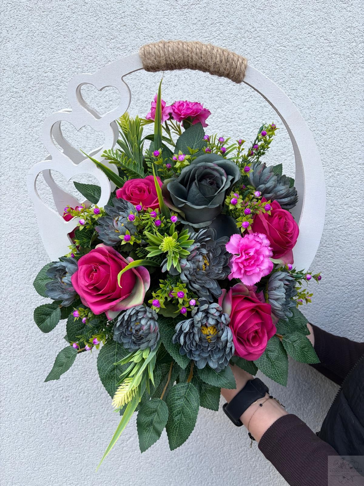 Elegancka kompozycja nagrobna wykonana w drewnianym białym koszu z dekoracyjnym uchwytem . Połączenie kwiatów w z dodatkami tworzą wyjątkowo harmonijną i pełną ciepła całość. Zieleń dekoracyjna nadaje kompozycji naturalny, spokojny charakter i pięknie dopełnia całość.