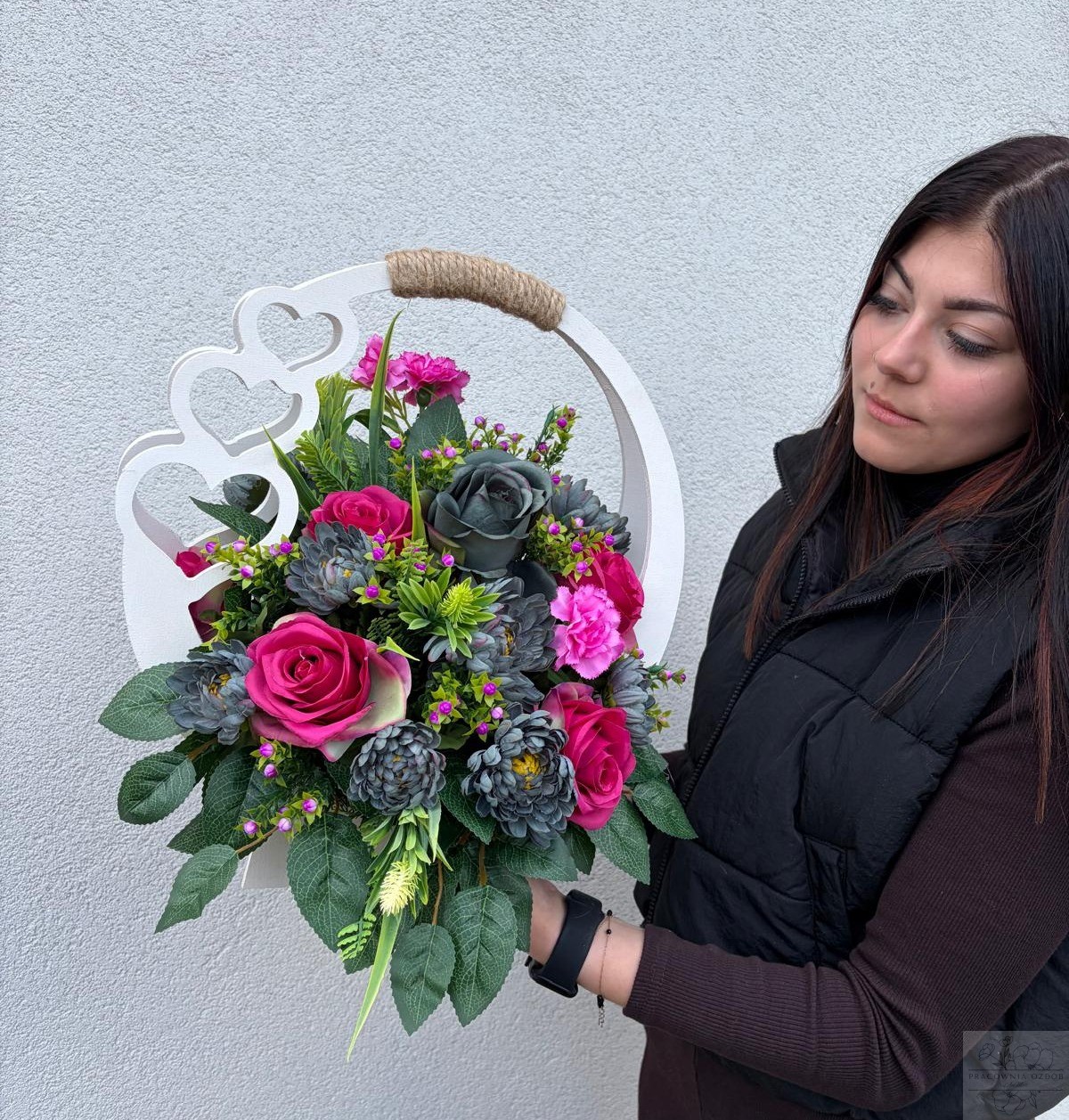Stroik w ozdobnym białym koszyczku "Grafit i Fuksja"