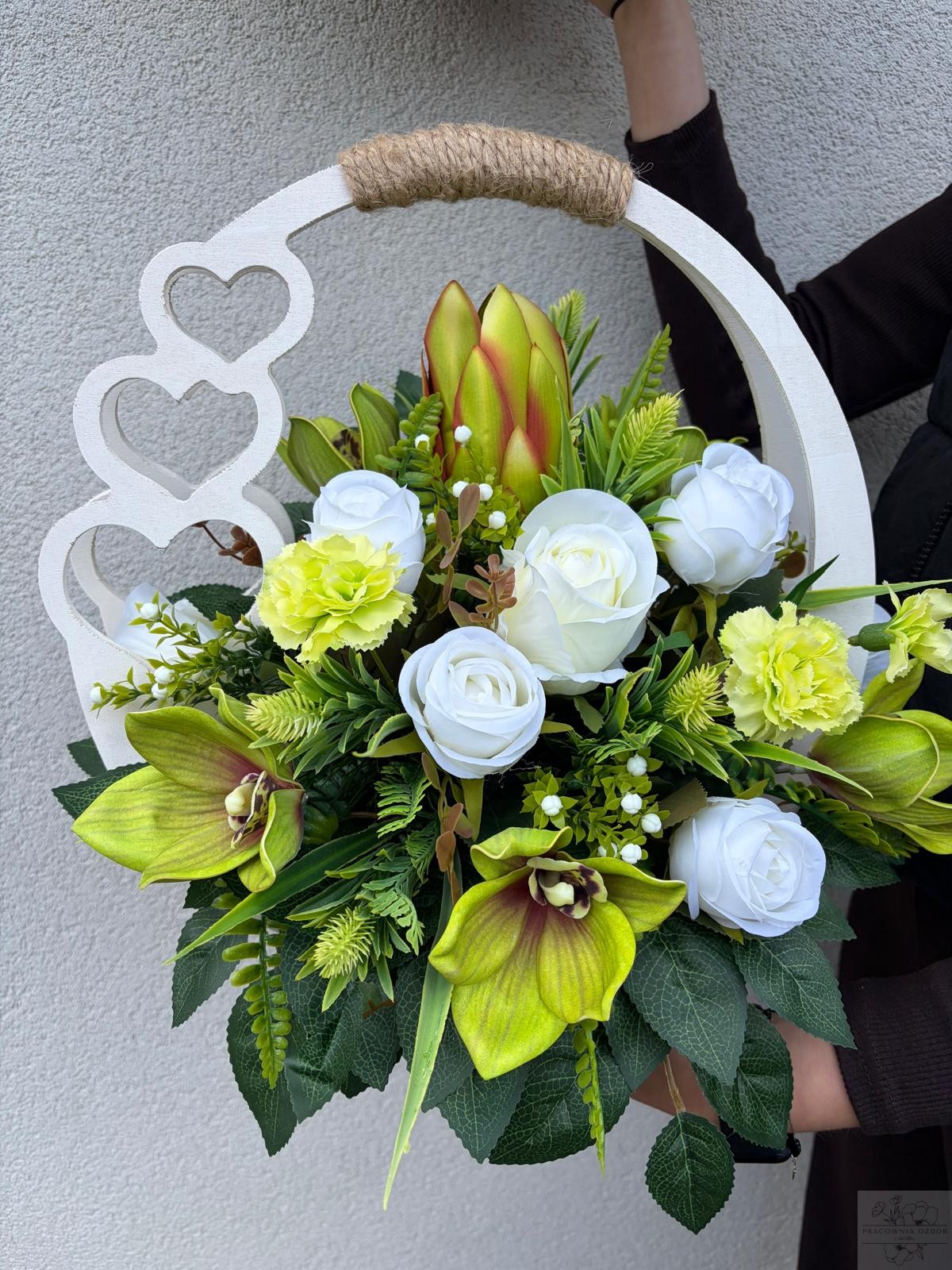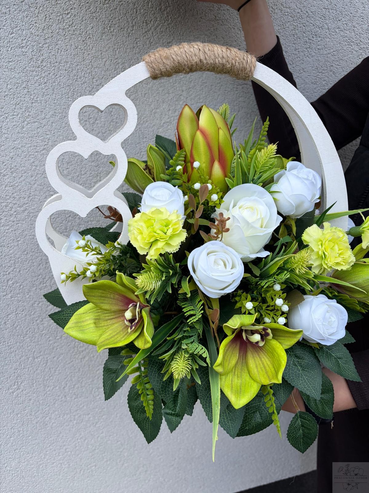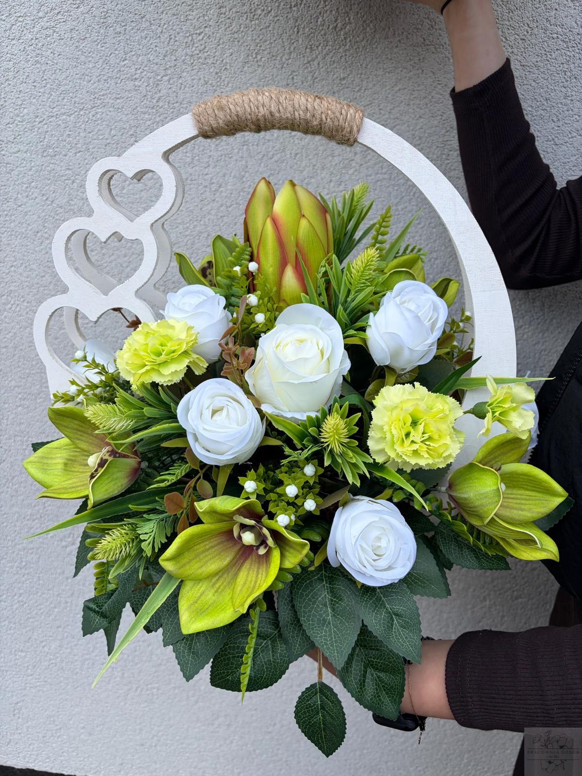 Elegancka kompozycja nagrobna wykonana w drewnianym białym koszu z dekoracyjnym uchwytem . Połączenie kwiatów w z dodatkami tworzą wyjątkowo harmonijną i pełną ciepła całość. Zieleń dekoracyjna nadaje kompozycji naturalny, spokojny charakter i pięknie dopełnia całość.