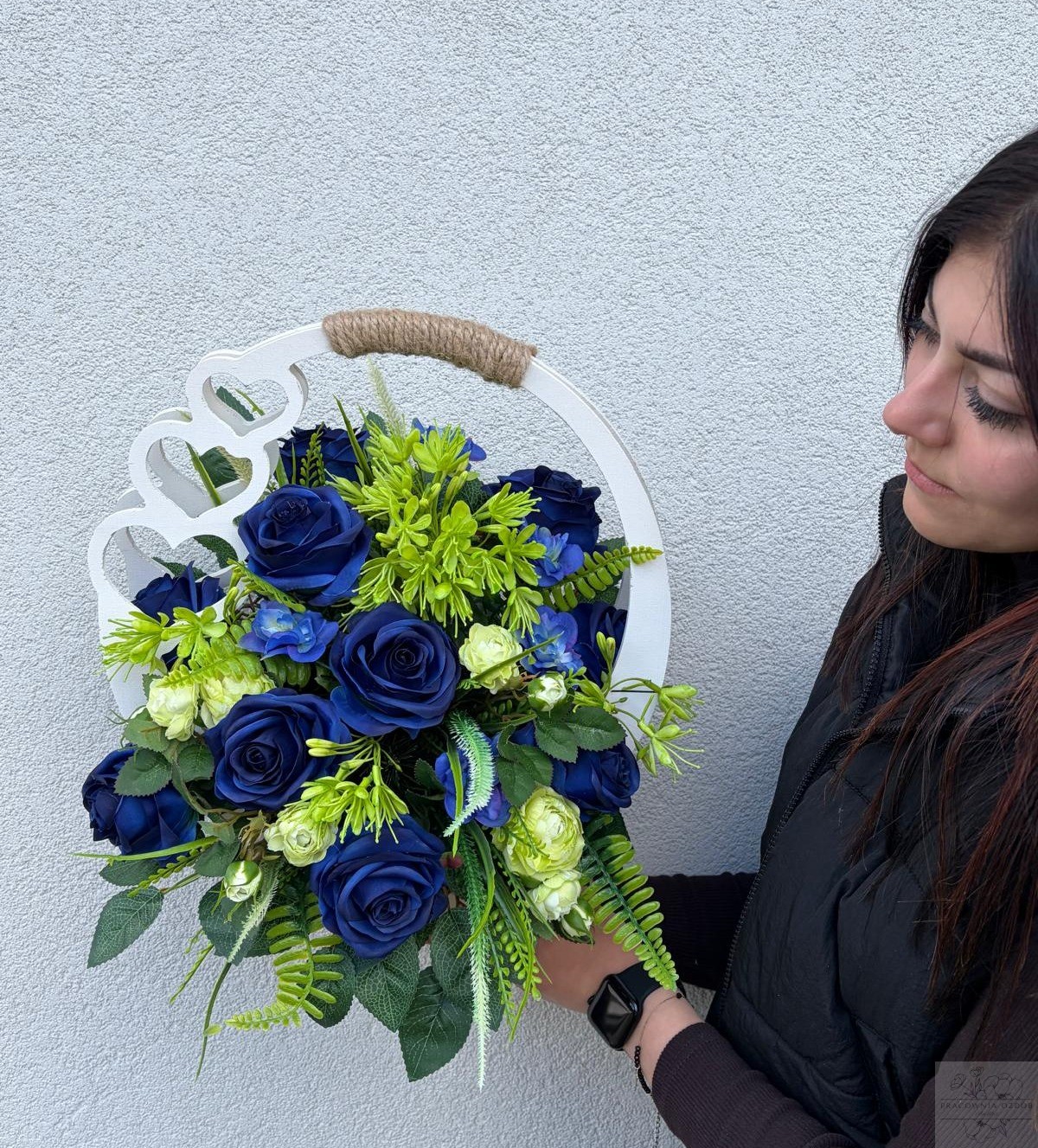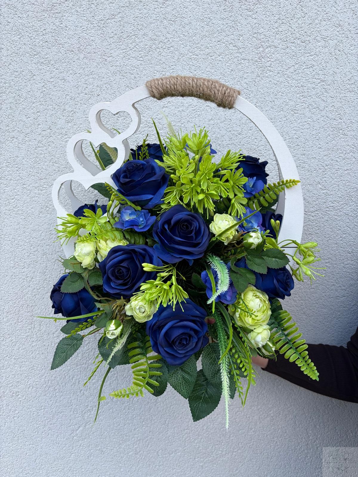 Stroik w ozdobnym białym koszyczku w chabrze i seledynie