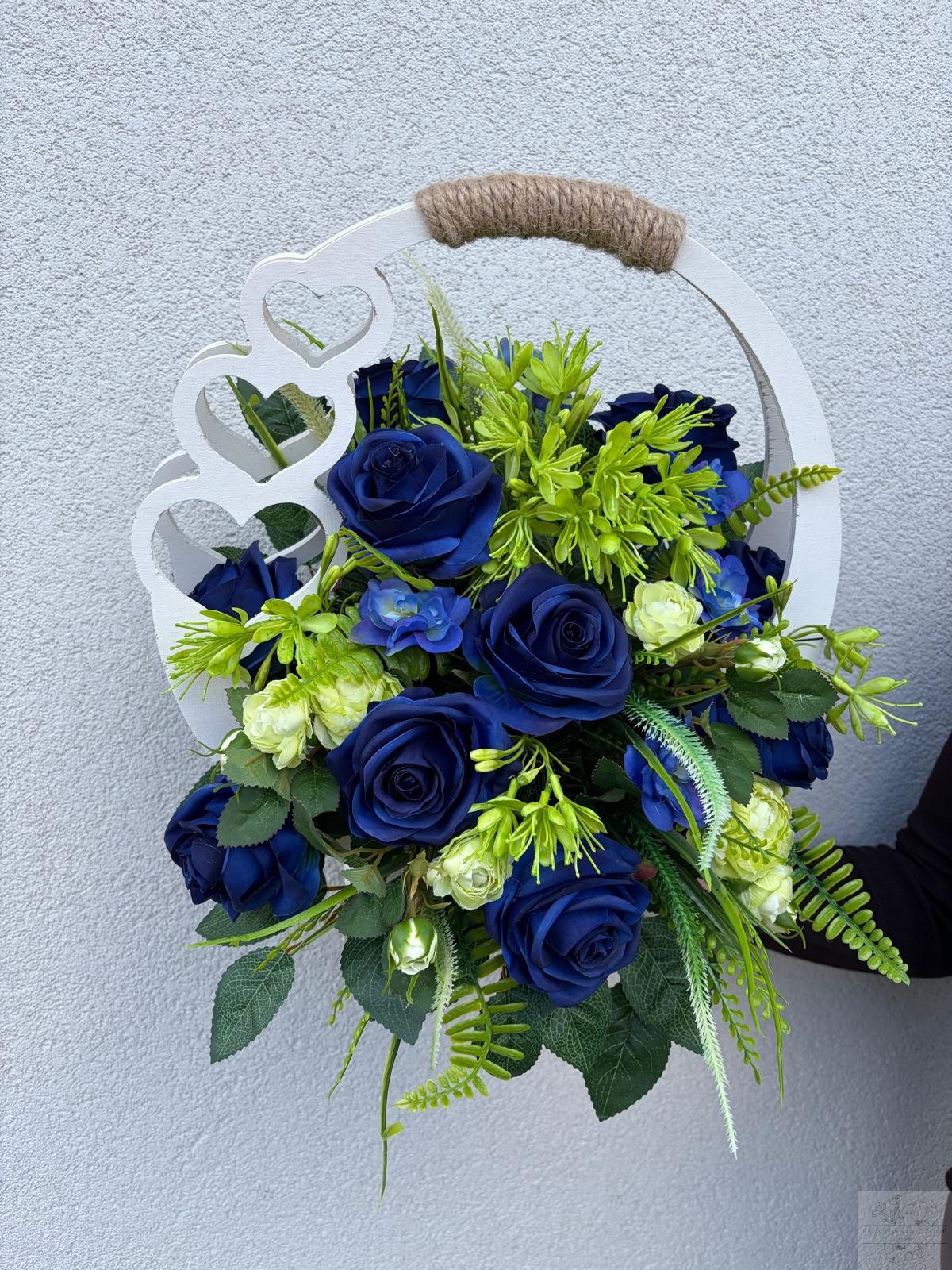 Elegancka kompozycja nagrobna wykonana w drewnianym białym koszu z dekoracyjnym uchwytem . Połączenie kwiatów w z dodatkami tworzą wyjątkowo harmonijną i pełną ciepła całość. Zieleń dekoracyjna nadaje kompozycji naturalny, spokojny charakter i pięknie dopełnia całość.