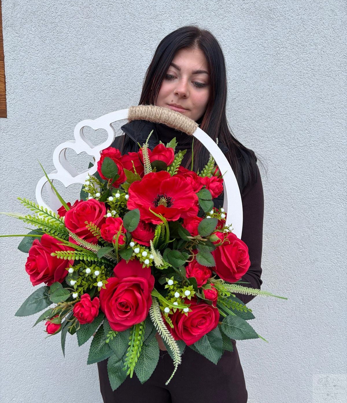 Elegancka kompozycja nagrobna wykonana w drewnianym bialym koszu z dekoracyjnym uchwytem . Połączenie kwiatów w z dodatkami tworzą wyjątkowo harmonijną i pełną ciepła całość. Zieleń dekoracyjna nadaje kompozycji naturalny, spokojny charakter i pięknie dopełnia całość.