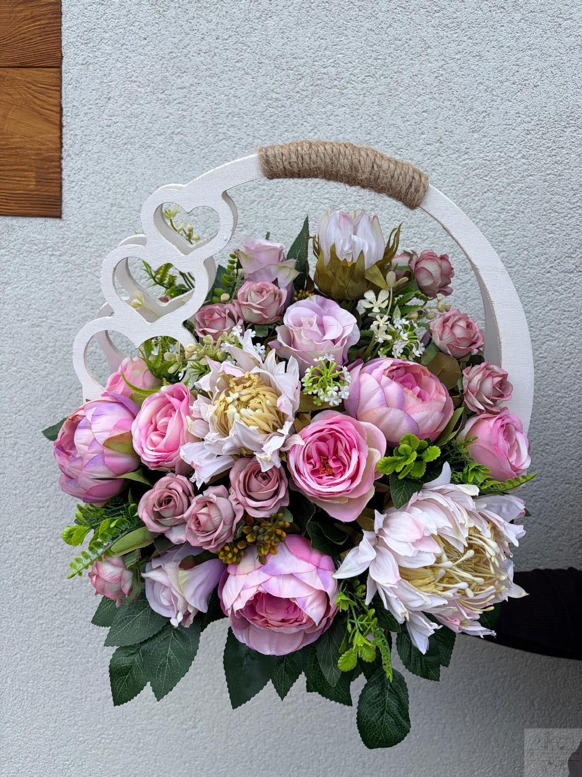 Elegancka kompozycja nagrobna wykonana w drewnianym białym koszu z dekoracyjnym uchwytem . Połączenie kwiatów w z dodatkami tworzą wyjątkowo harmonijną i pełną ciepła całość. Zieleń dekoracyjna nadaje kompozycji naturalny, spokojny charakter i pięknie dopełnia całość.