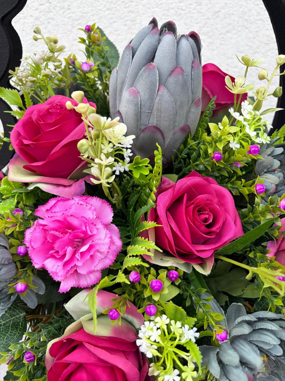 Ta aranżacja symbolizuje pamięć, szacunek i miłość, stanowiąc godny wyraz wspomnień o bliskiej osobie. Idealna na grób zarówno w okresie wiosennym, jak i całorocznym.