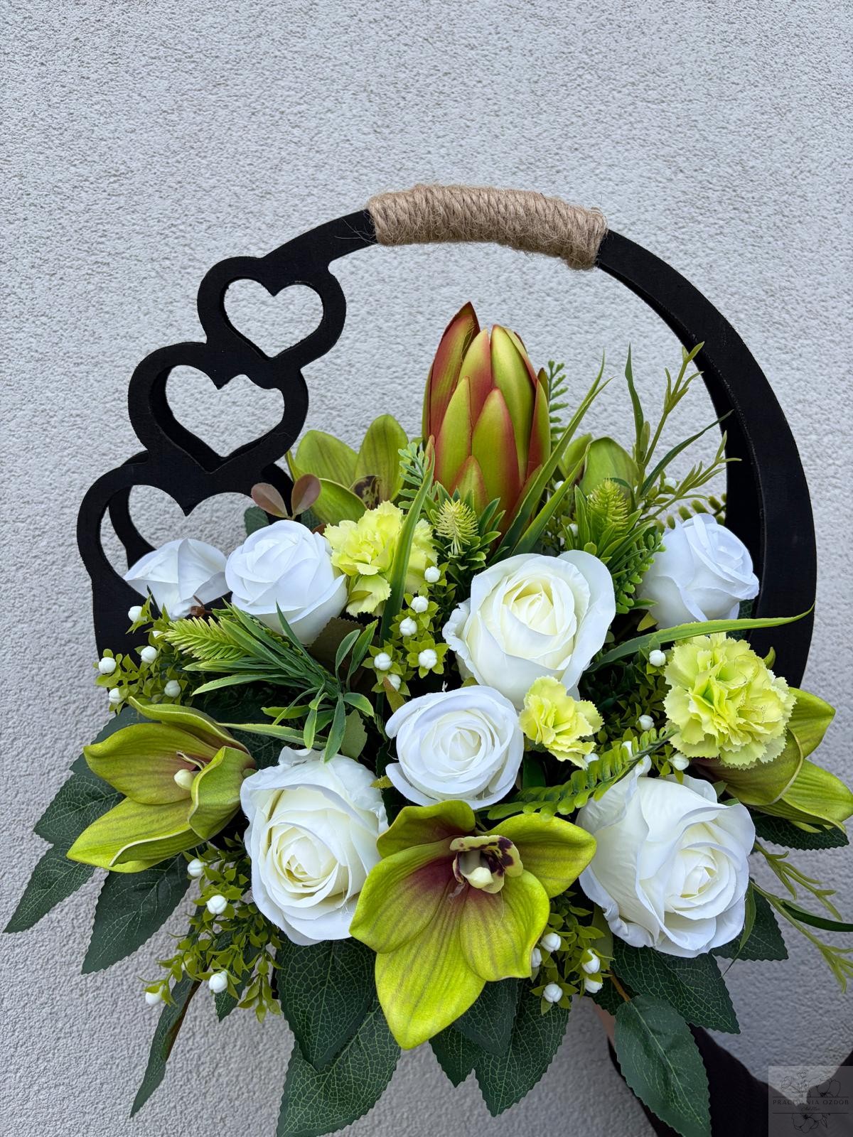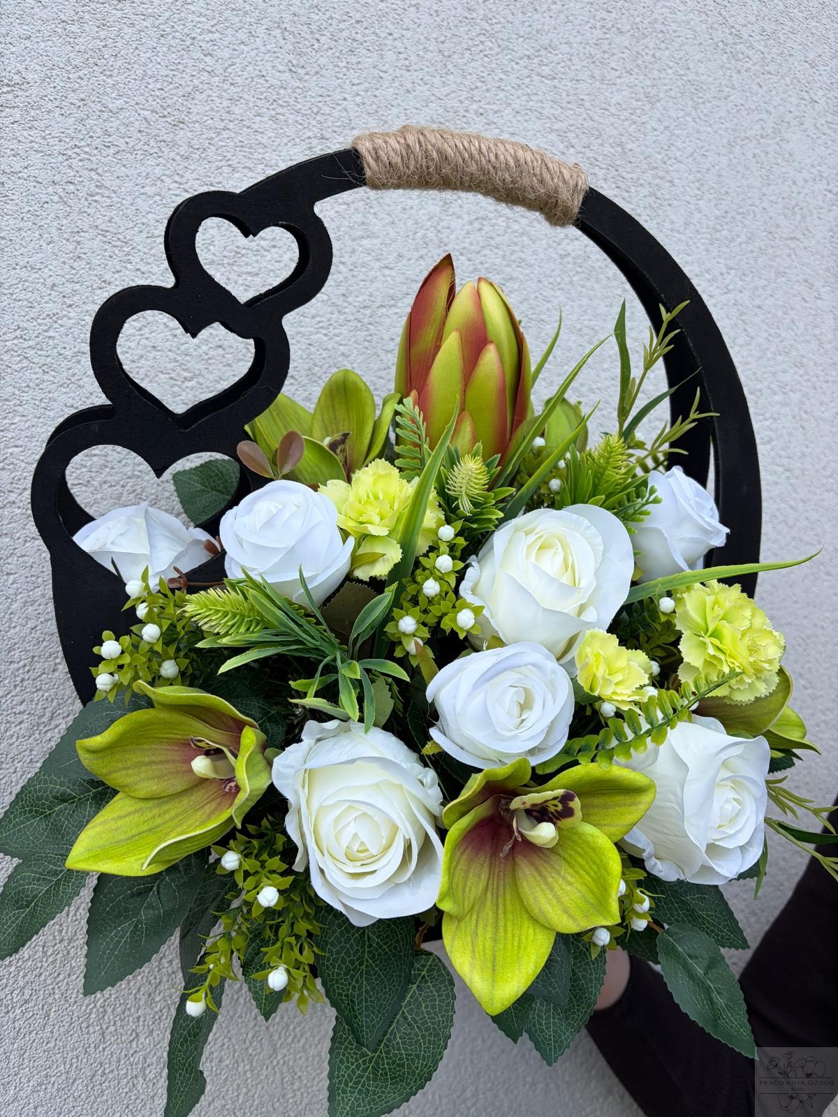 Elegancka kompozycja nagrobna wykonana w drewnianym czarnym koszu z dekoracyjnym uchwytem . Połączenie kwiatów w z dodatkami tworzą wyjątkowo harmonijną i pełną ciepła całość. Zieleń dekoracyjna nadaje kompozycji naturalny, spokojny charakter i pięknie dopełnia całość.