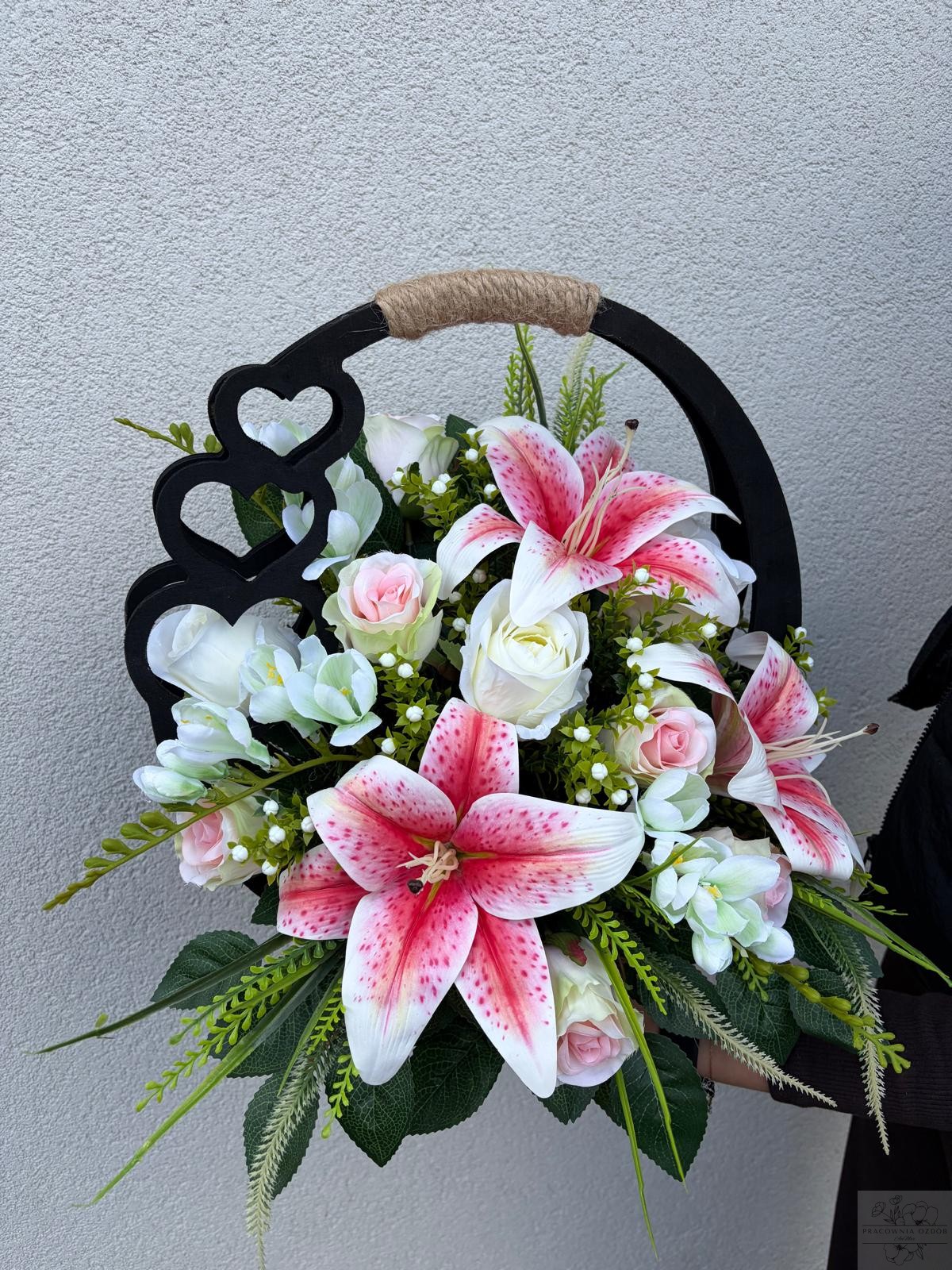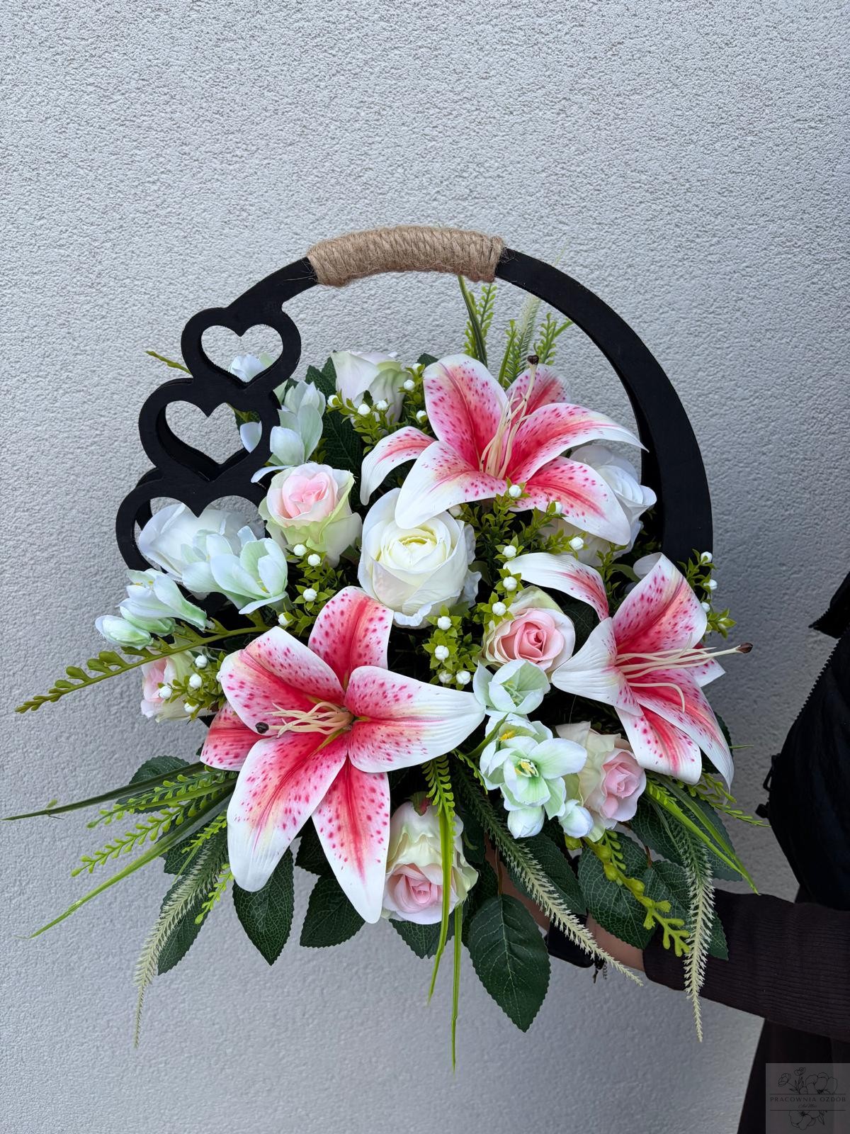 Elegancka kompozycja nagrobna wykonana w drewnianym czarnym koszu z dekoracyjnym uchwytem . Połączenie kwiatów w z dodatkami tworzą wyjątkowo harmonijną i pełną ciepła całość. Zieleń dekoracyjna nadaje kompozycji naturalny, spokojny charakter i pięknie dopełnia całość.