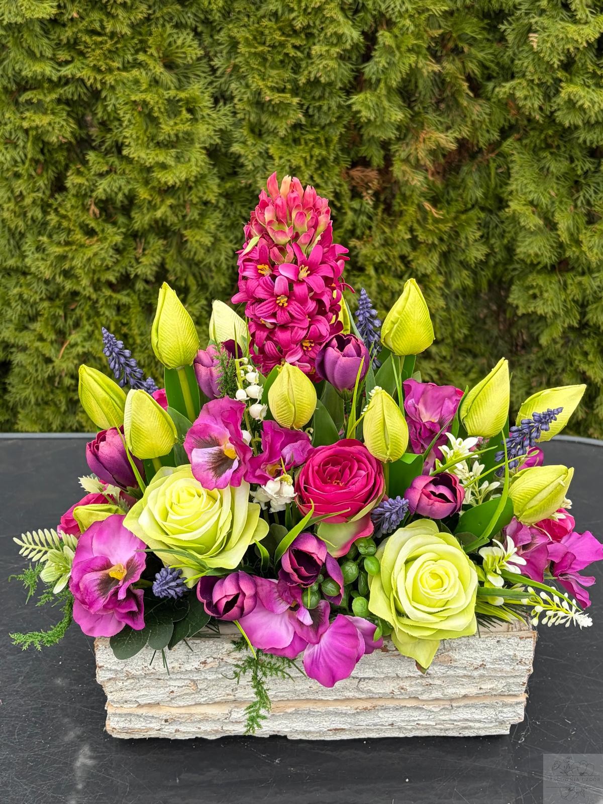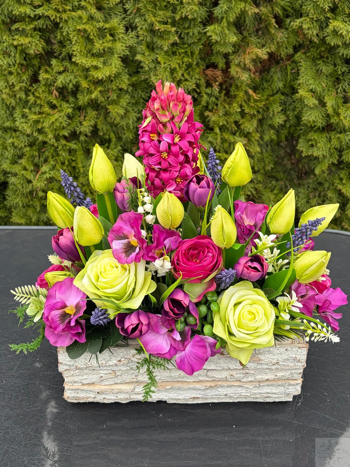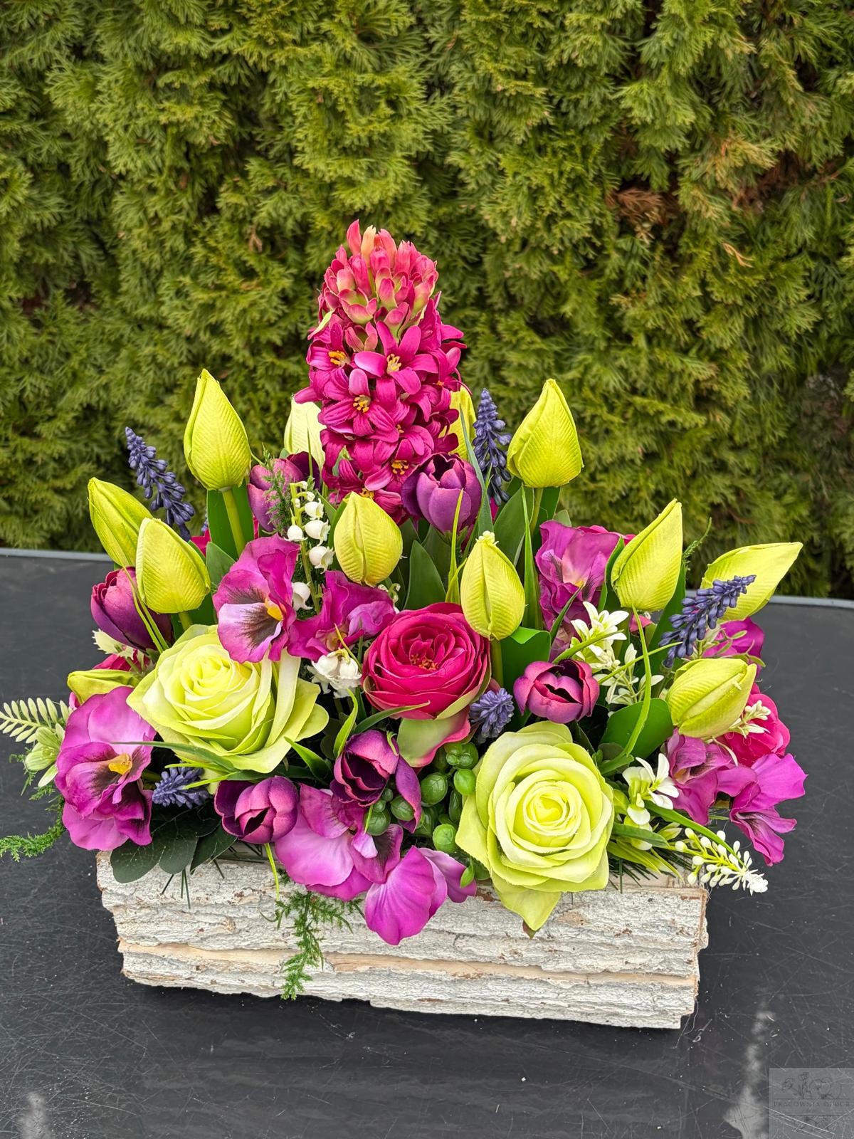 Elegancka kompozycja nagrobna wykonana z wysokiej jakości kwiatów sztucznych, które wiernie odwzorowują naturalne rośliny. Starannie dobrane kwiaty i dodatki tworzą harmonijną, efektowną całość, podkreślającą pamięć oraz szacunek dla bliskiej osoby. Kompozycja została osadzona w stabilnej, dekoracyjnej podstawie, dzięki czemu idealnie prezentuje się na pomniku. Kompozycja zachowana w delikatnej, wiosennej kolorystyce.