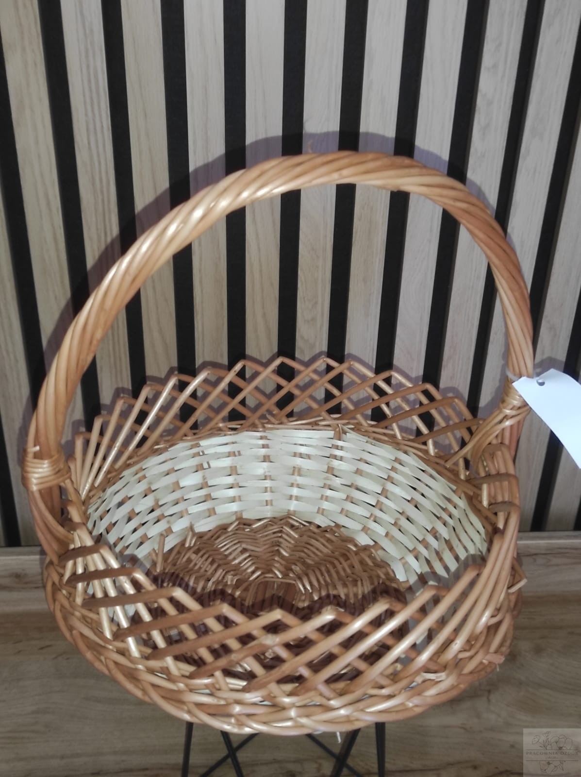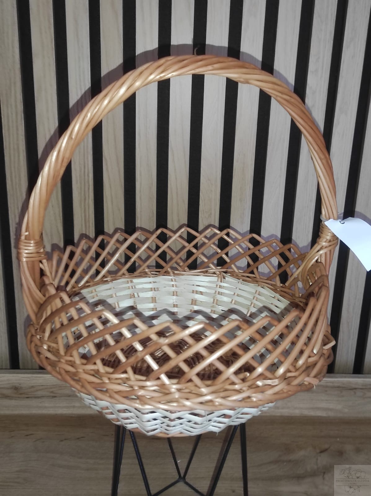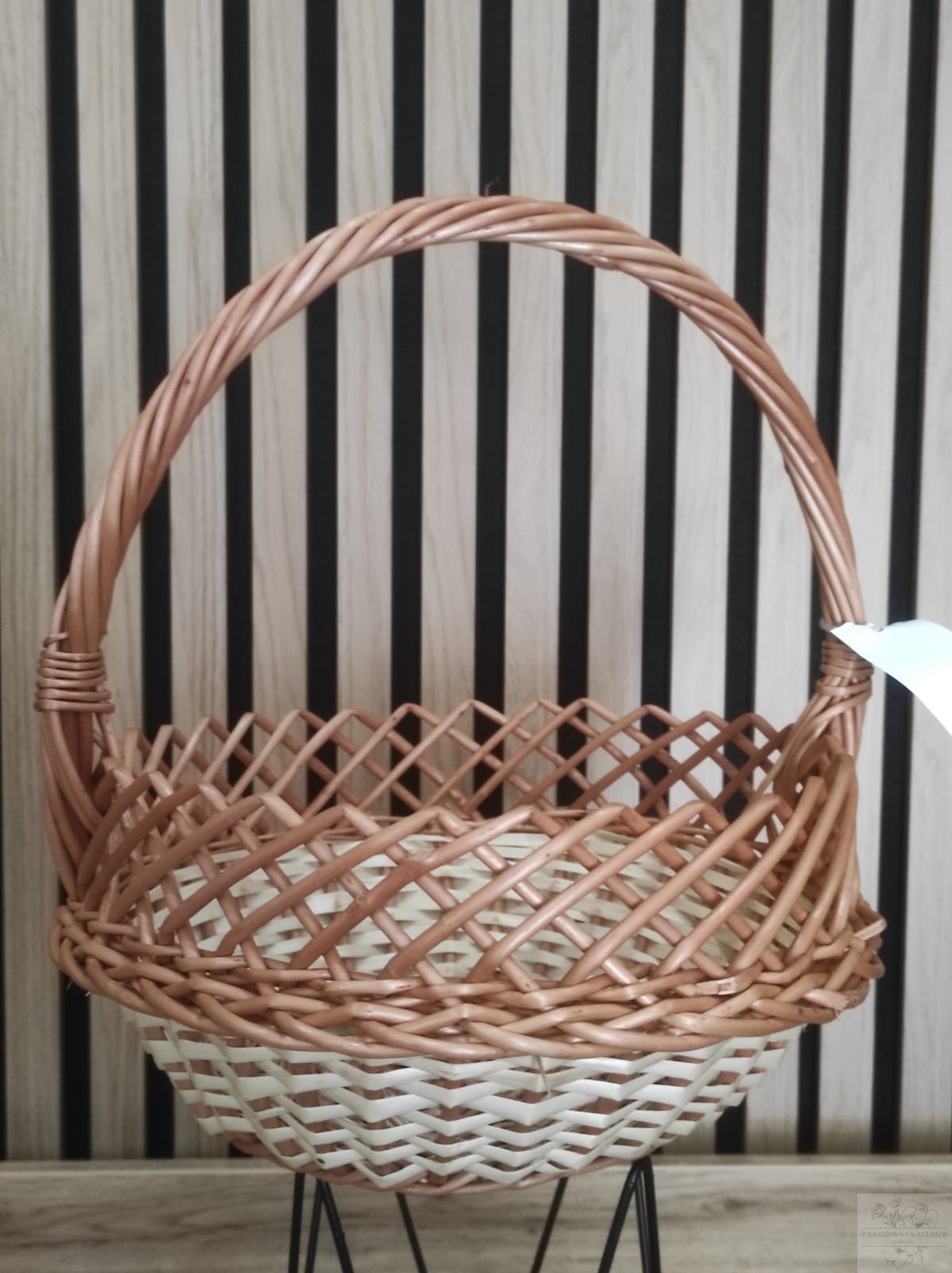 Koszyczek utrzymany jest w naturalnych, ciepłych odcieniach wikliny z jasnymi akcentami, które nadają mu wyjątkowego charakteru. Wygodny, stabilny uchwyt zapewnia komfortowe przenoszenie, a pojemne wnętrze bez problemu pomieści święconkę, pisanki, babkę wielkanocną czy inne świąteczne dodatki.