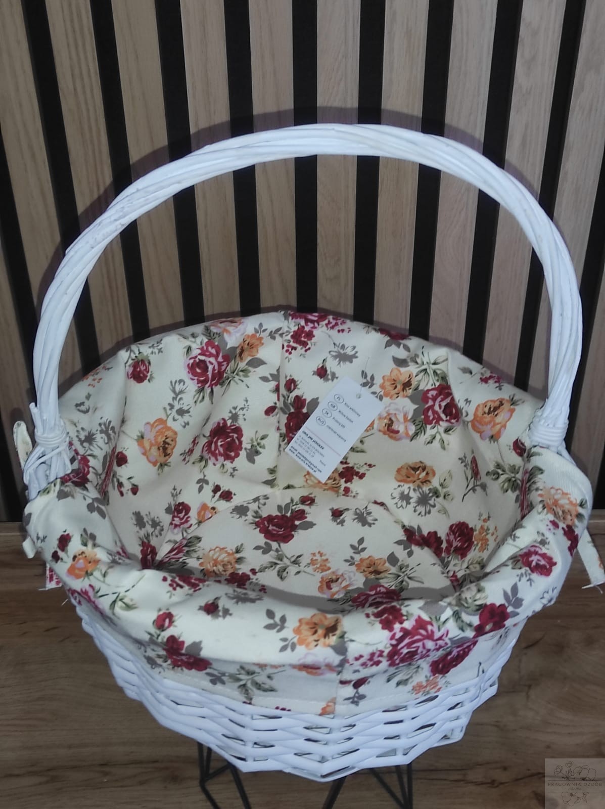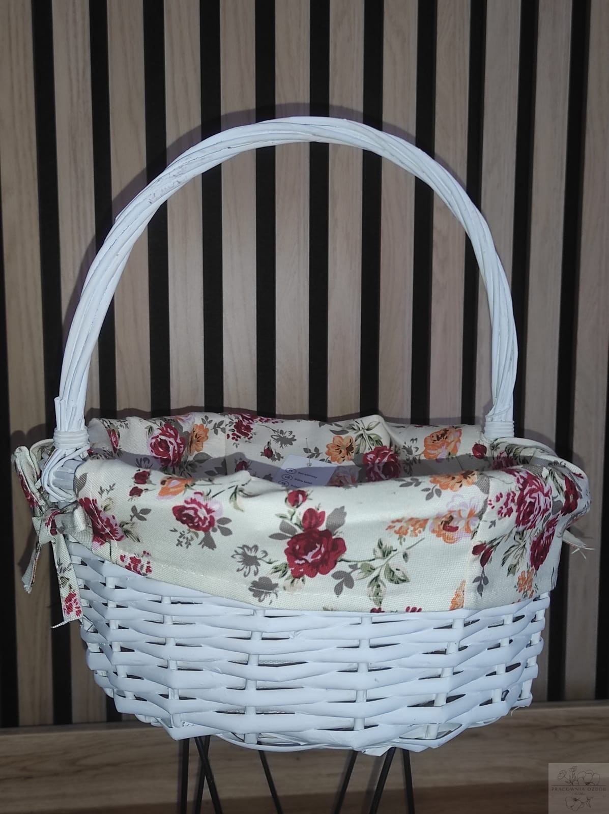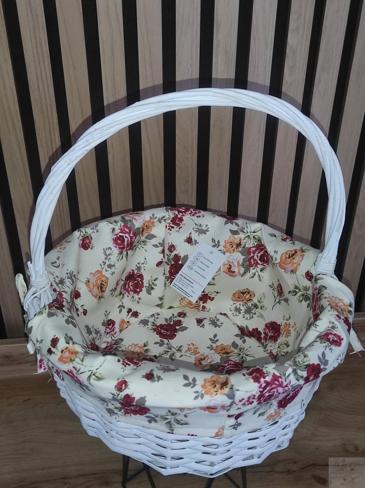 Wnętrze koszyczka wyłożone jest miękką, materiałową wyściółką w delikatny kwiatowy wzór. Wyściółka nie tylko dodaje uroku i romantycznego stylu, ale również chroni zawartość koszyka i zapewnia estetyczne wykończenie całości. Stabilny, wygodny uchwyt ułatwia przenoszenie koszyczka.