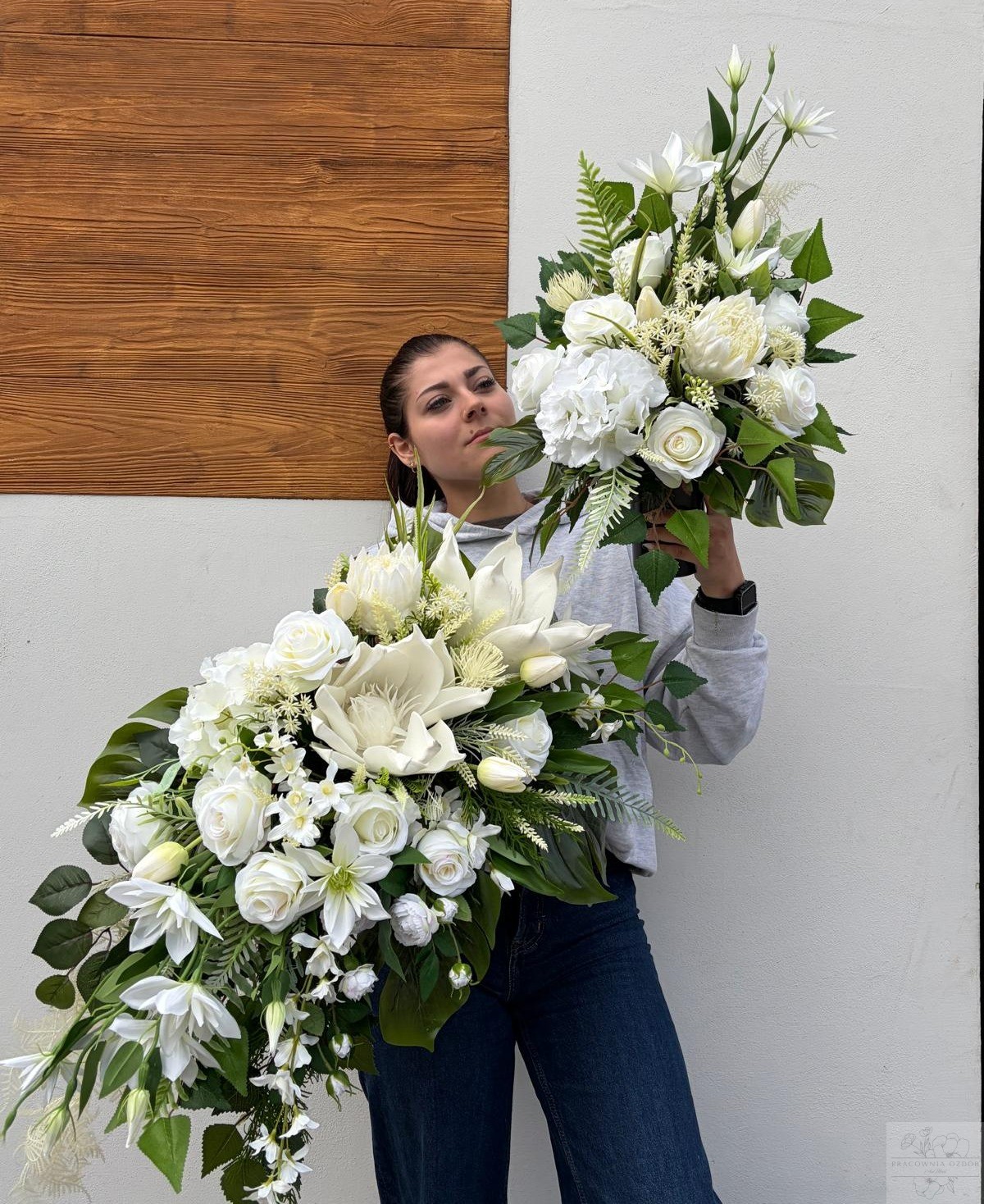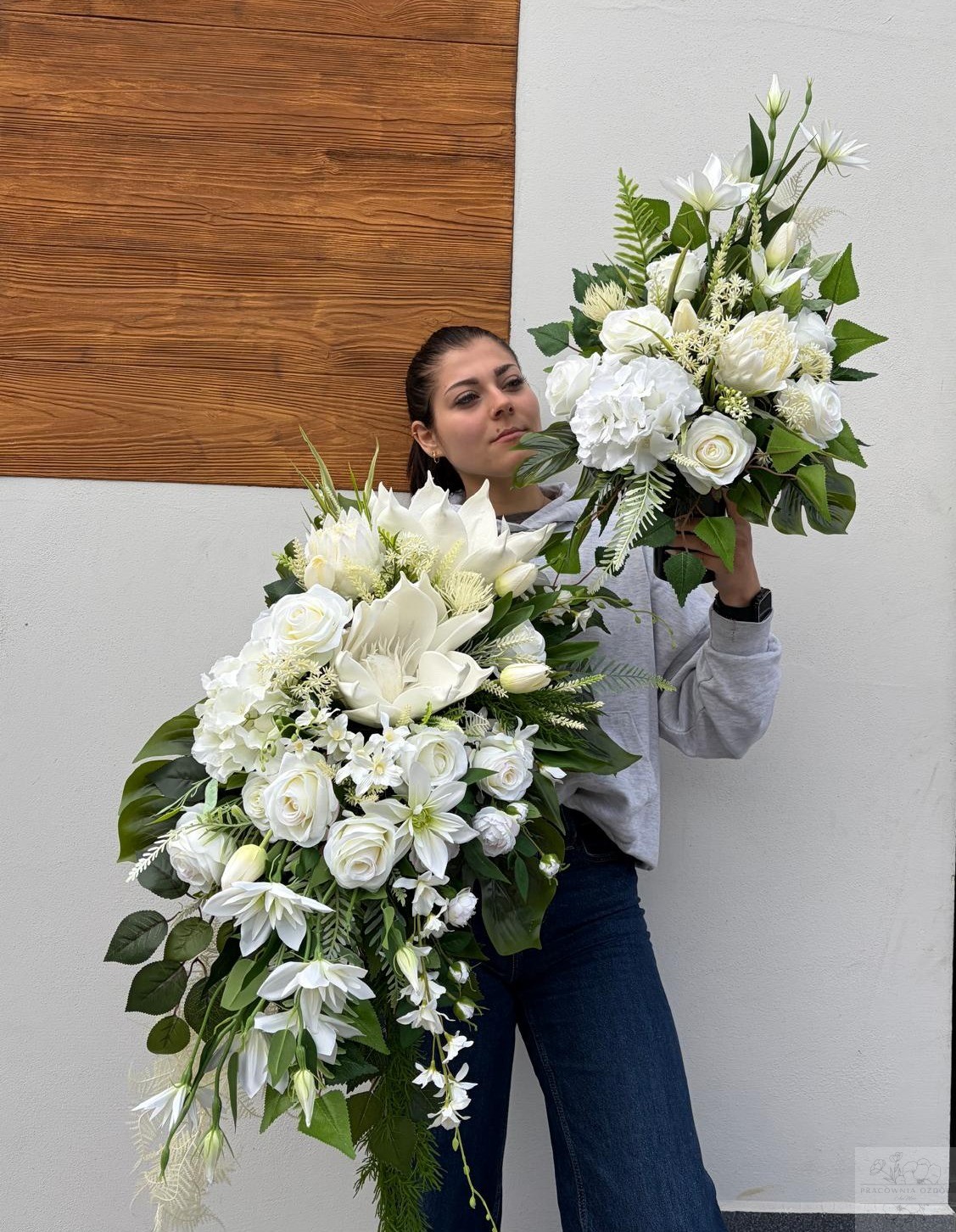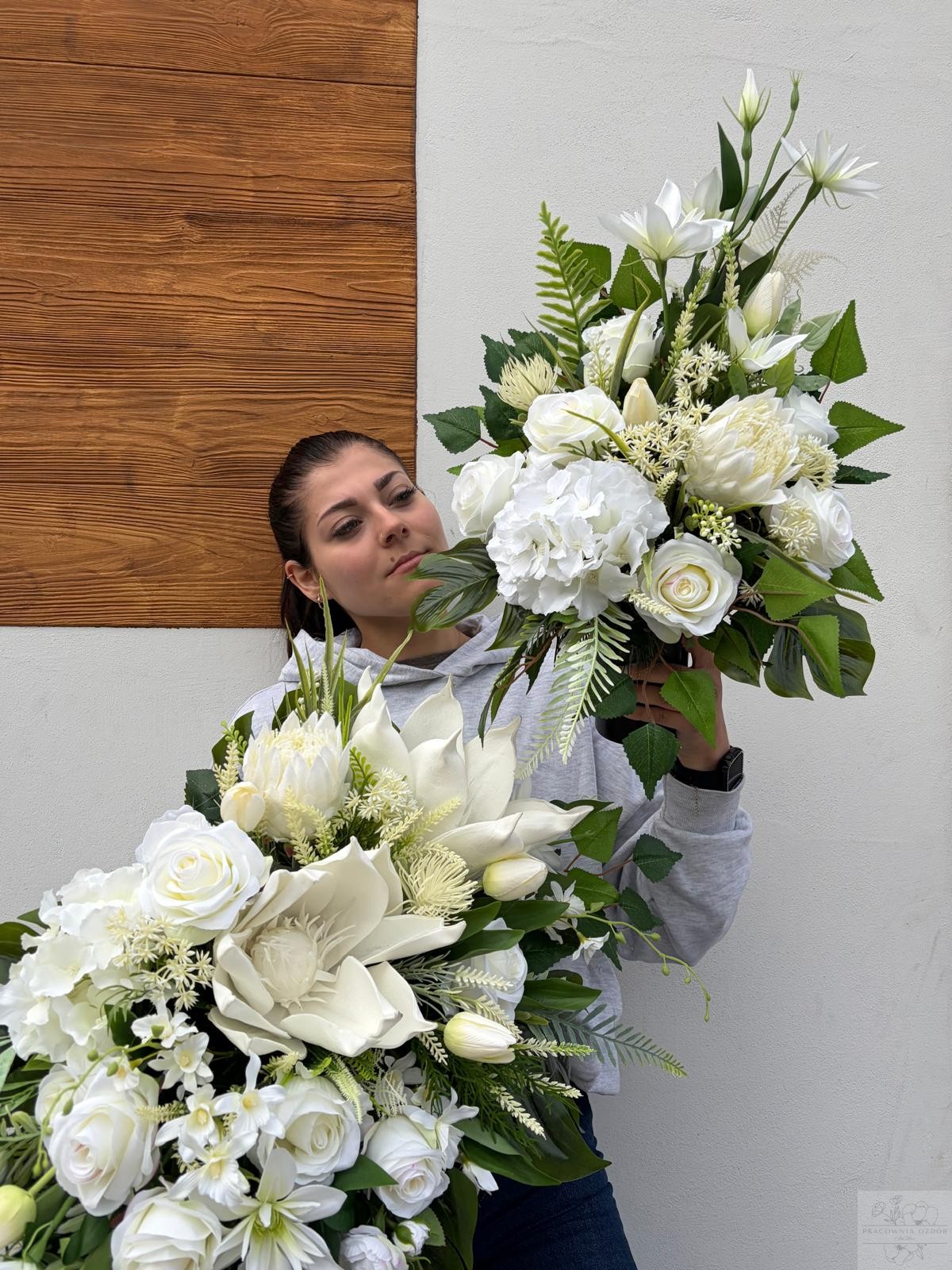 Zestaw: Elegancka kompozycja nagrobna + bukiet w bieli