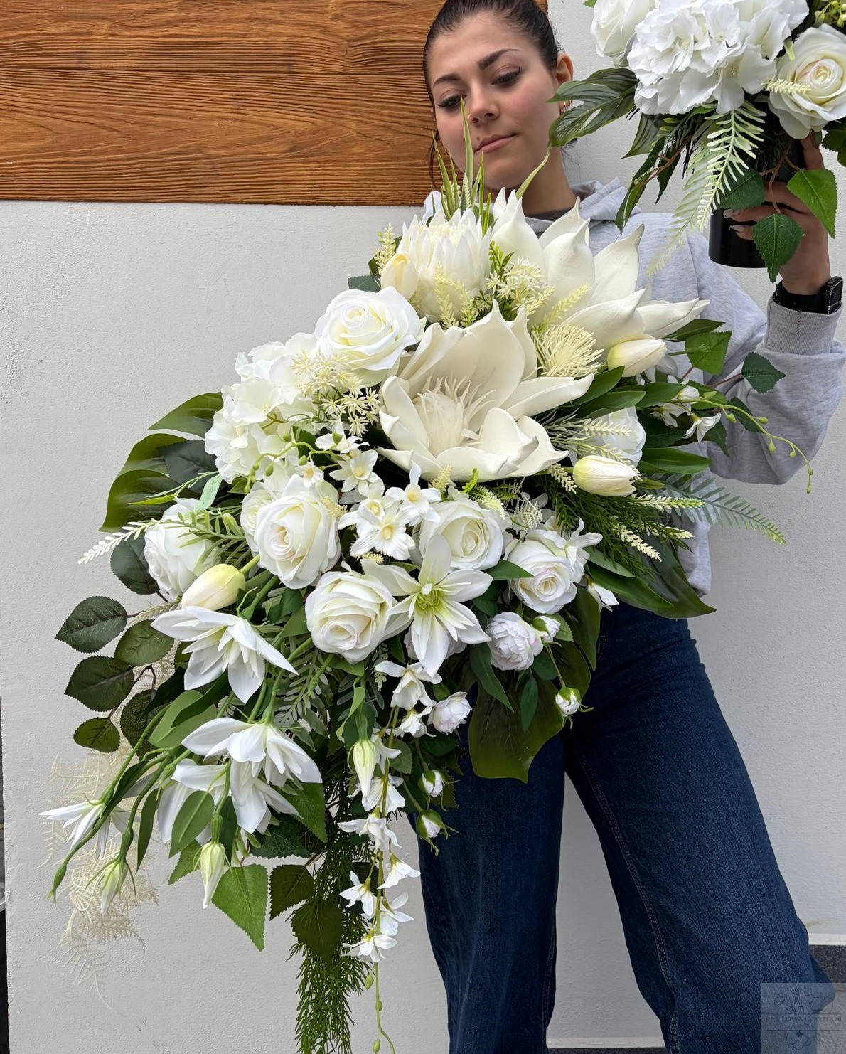 Kompozycja wyróżnia się starannym wykonaniem oraz dopracowanymi detalami – od delikatnych płatków po elegancko opadające elementy, które tworzą efekt lekkości i szlachetności. Dzięki wysokiej jakości materiałom zachowuje estetyczny wygląd przez długi czas.