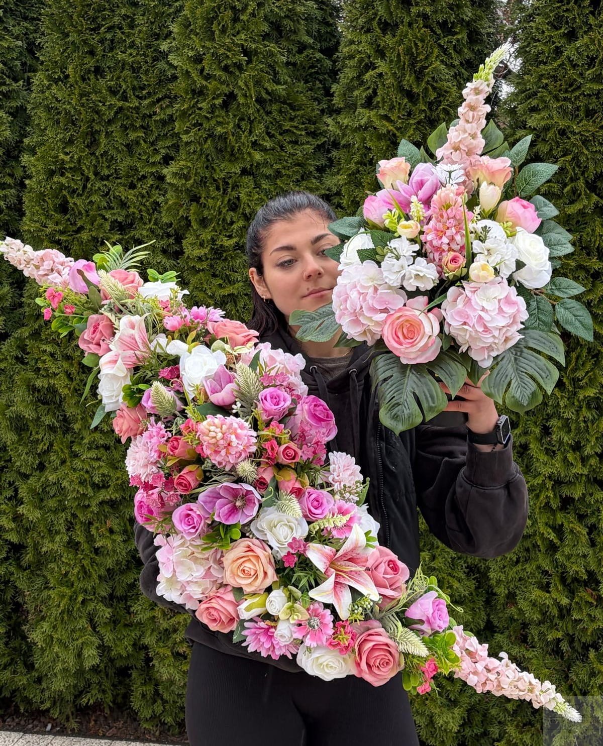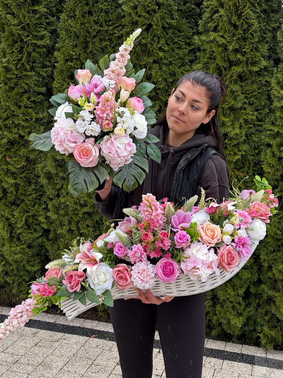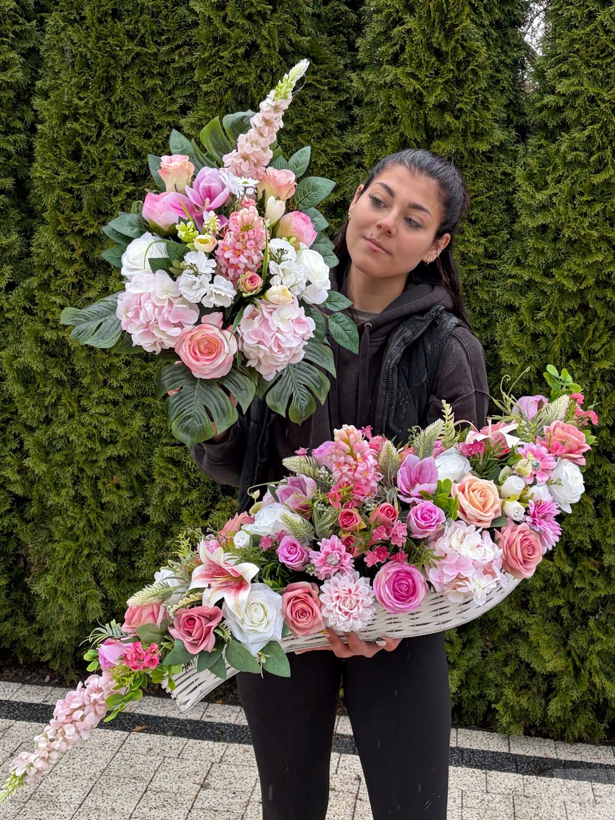 Subtelna i elegancka kompozycja nagrobna wykonana z wysokiej jakości kwiatów sztucznych, które do złudzenia przypominają żywe. Połączenie kwiatów białych i różowych wraz z naturalną zielenią nadaje aranżacji świeżości, lekkości i wyjątkowego uroku.