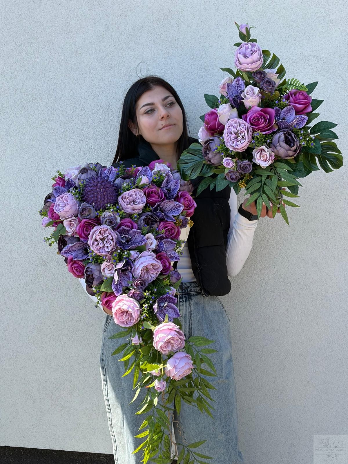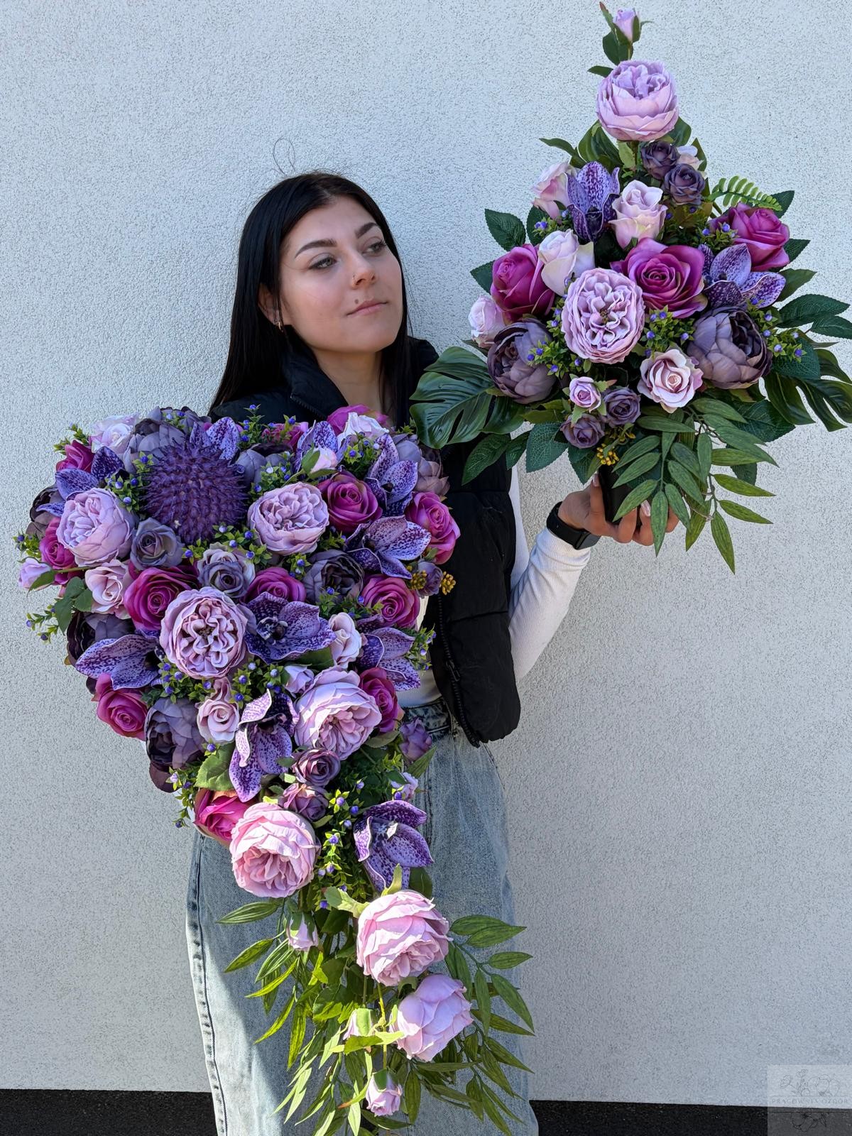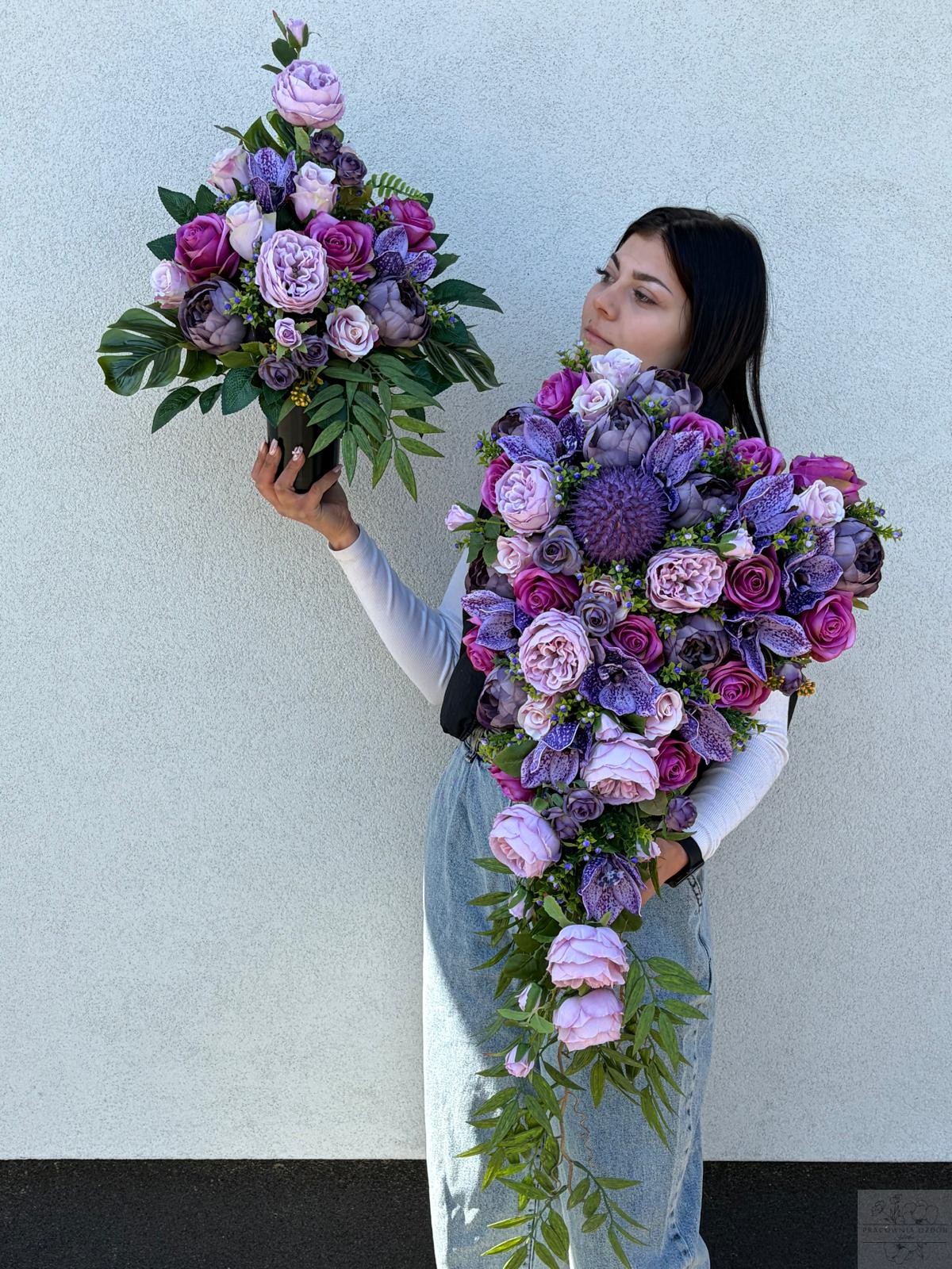 W kompozycji wykorzystano wysokiej jakości kwiaty sztuczne, wiernie odwzorowujące naturalne róże, piwonie oraz dodatki zieleni dekoracyjnej. Całość uzupełniają efektowne pastelowo fioletowe akcenty w postaci dekoracyjnych piwonii, które nadają aranżacji wyjątkowego charakteru i elegancji. Kompozycja osadzona jest na stabilnej podstawie.