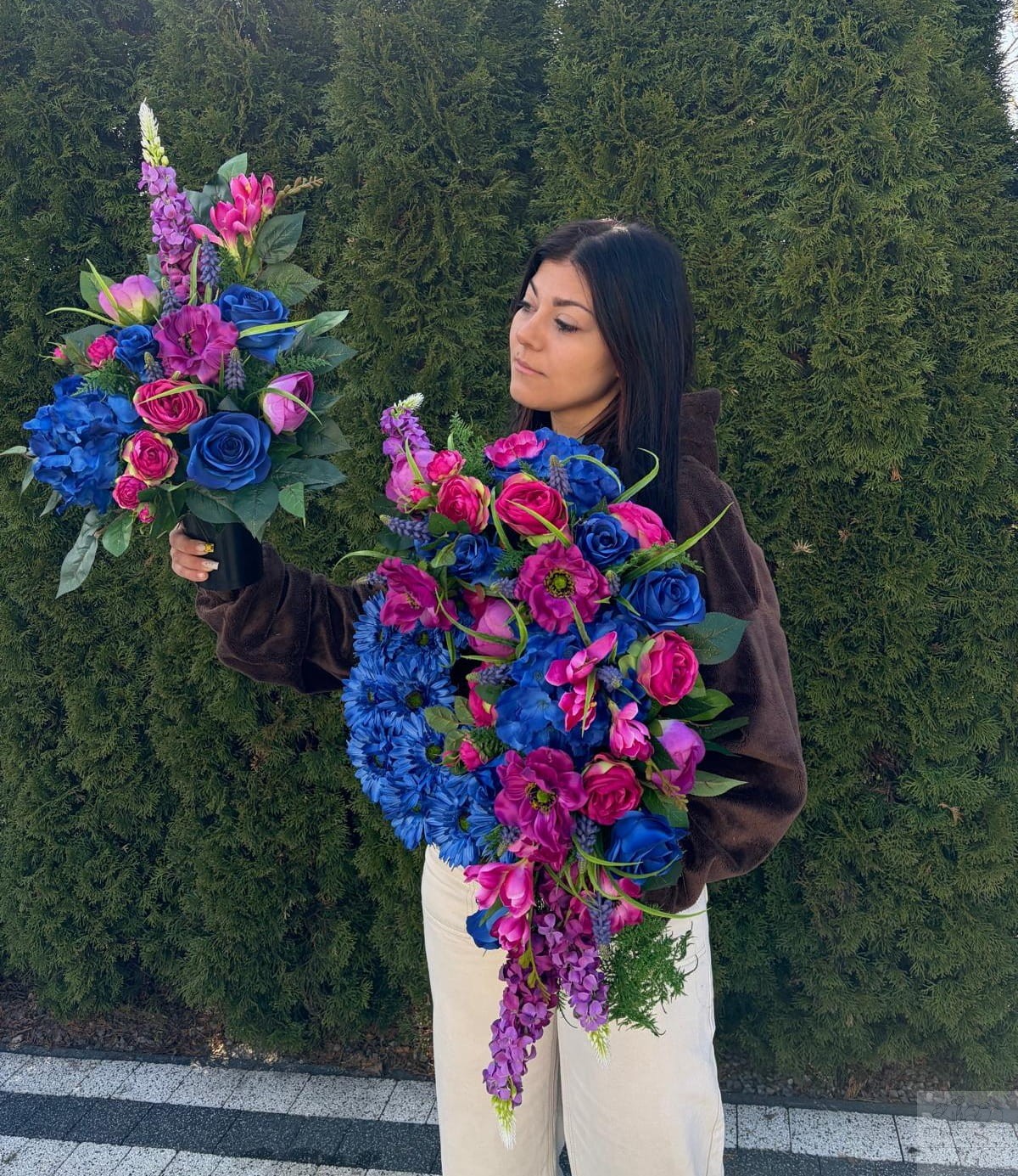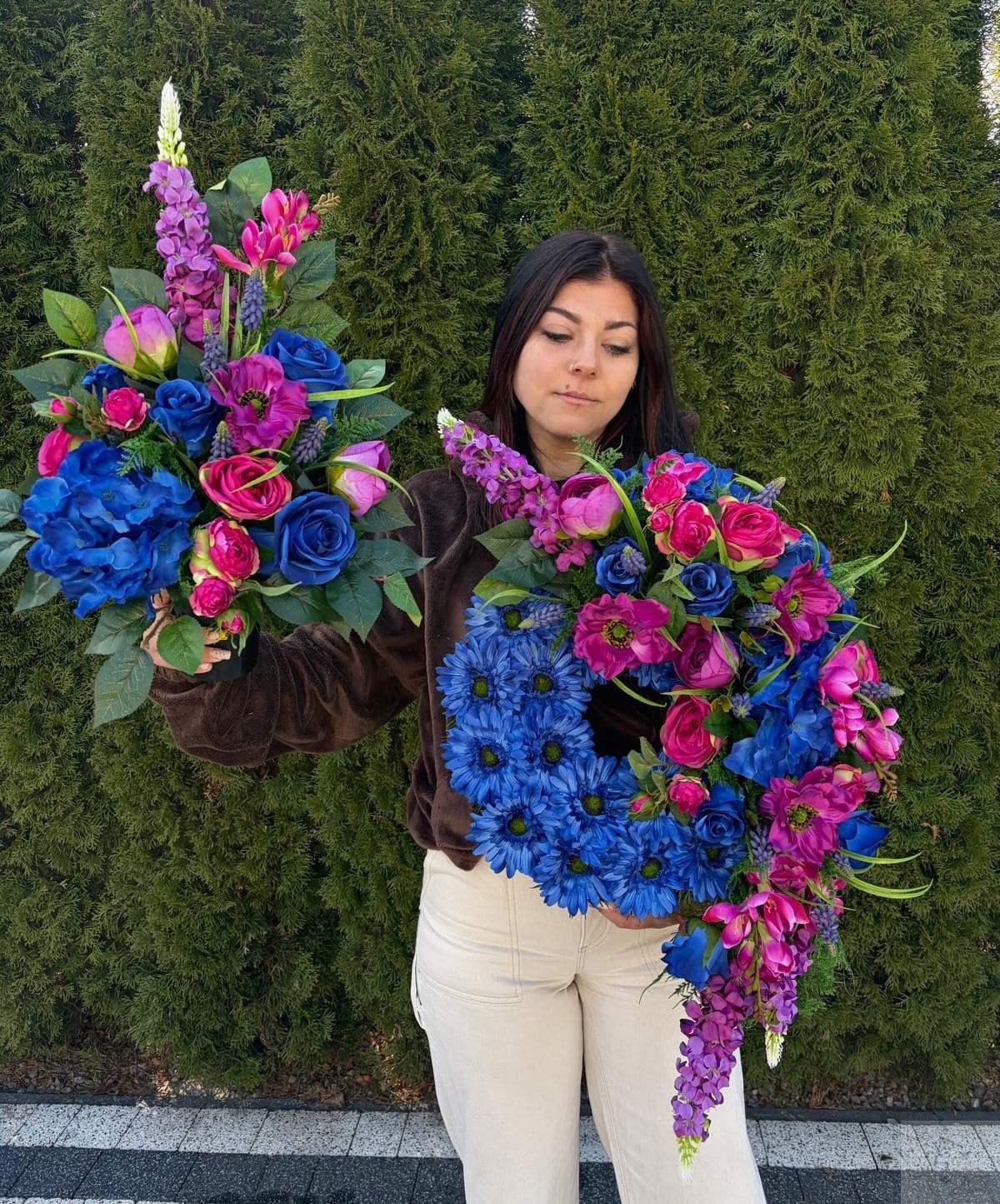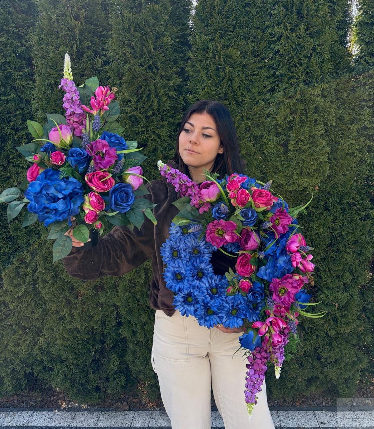 Elegancka i wyjątkowo efektowna kompozycja nagrobna wykonana z najwyższej jakości sztucznych kwiatów. Połączenie kwiatów w odcieniach chabru i intensywnej fuksji oraz dekoracyjną zielenią tworzy pełną wdzięku i harmonii całość.