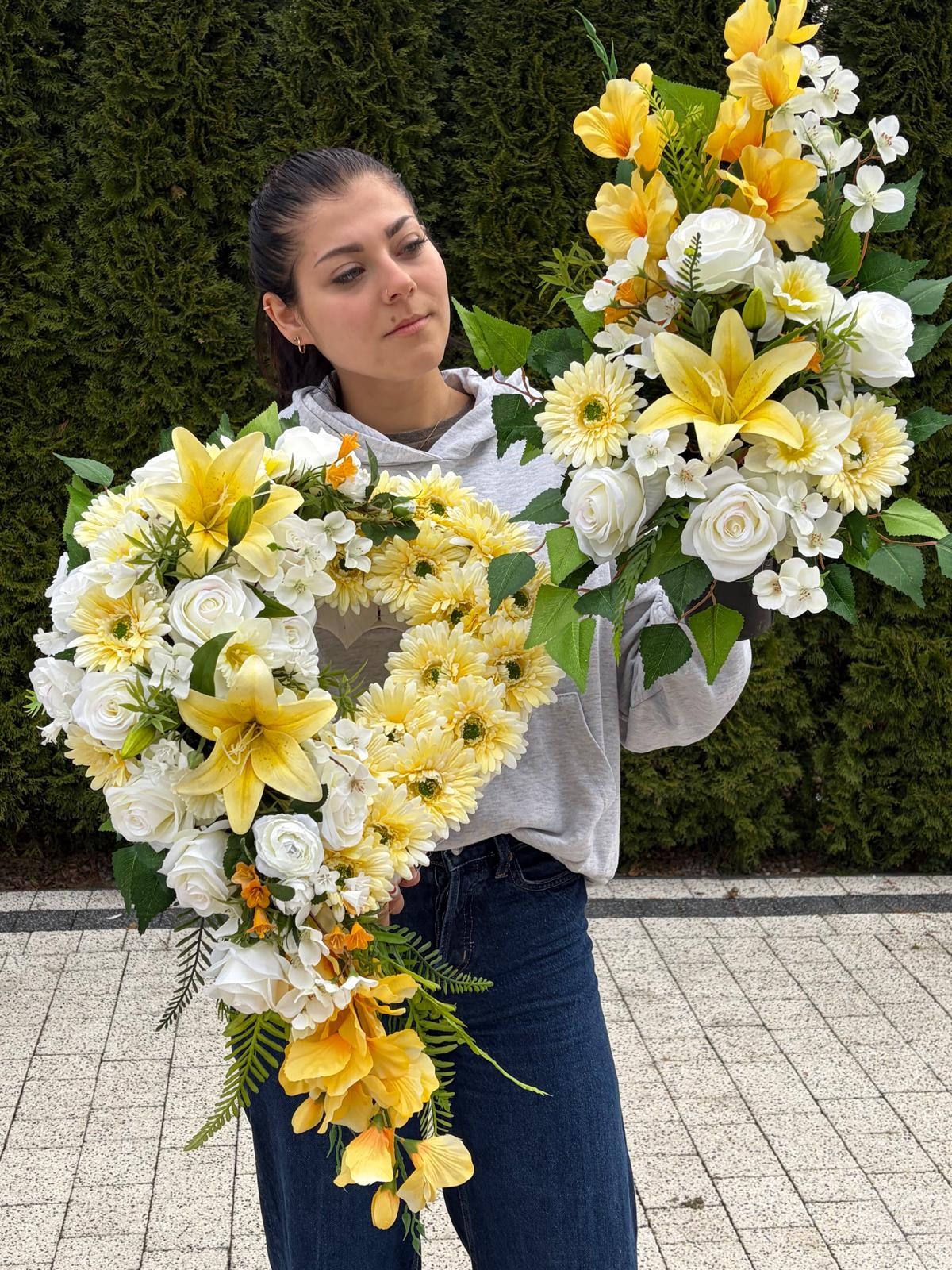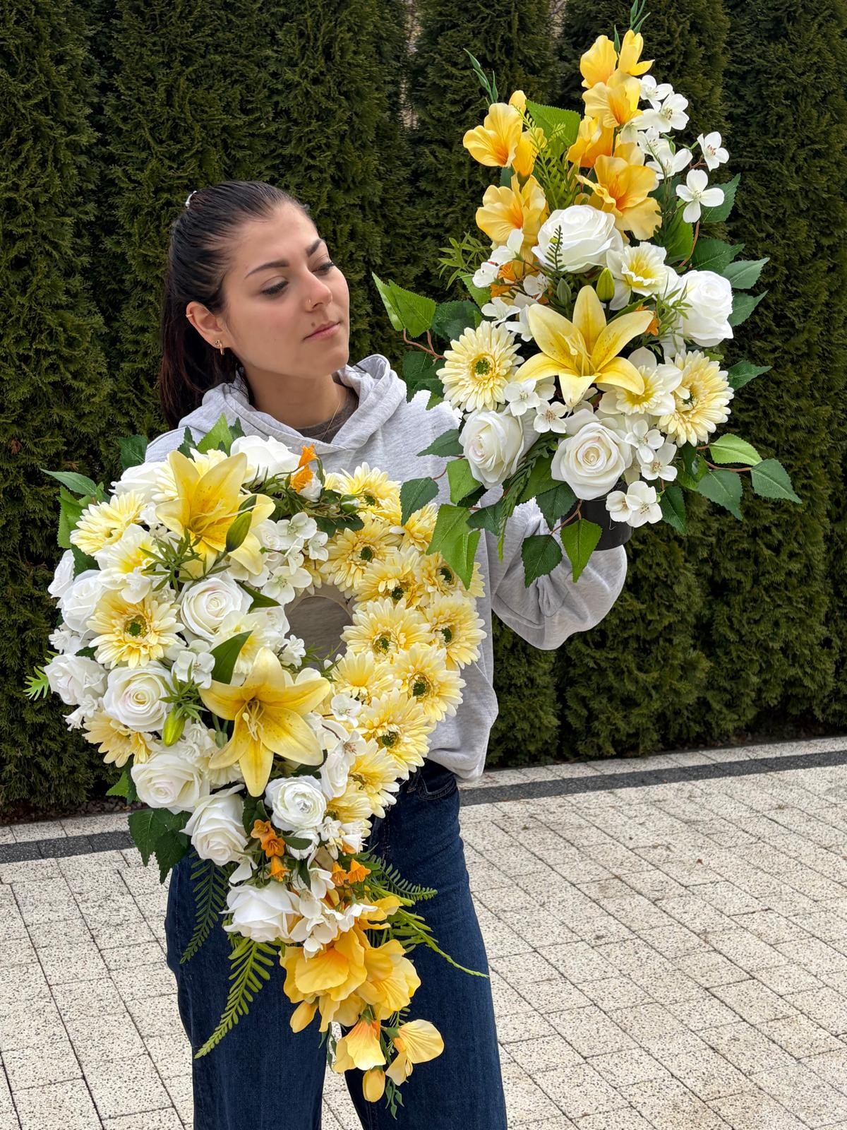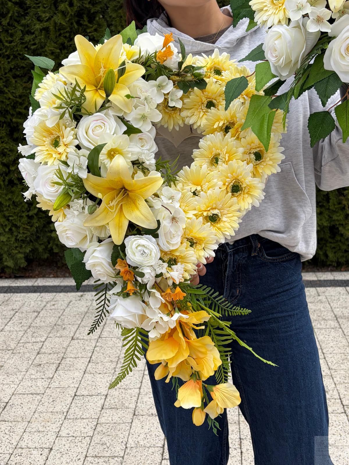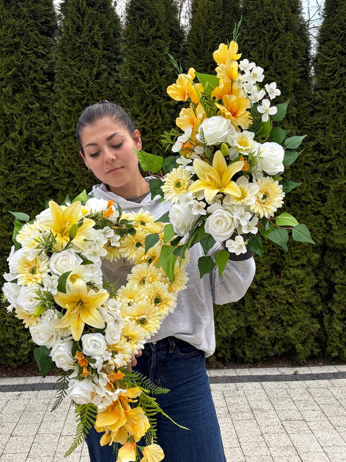 Elegancka kompozycja nagrobna w formie serca, wykonana z wysokiej jakości sztucznych kwiatów, zachwyca harmonią kolorów i naturalnym wyglądem. Dominują tu kwiaty w odcieniach żółtego oraz kwiatami dekoracyjnymi w tonacjach bieli , co nadaje całości wyjątkowo ciepły, pełen spokoju charakter.