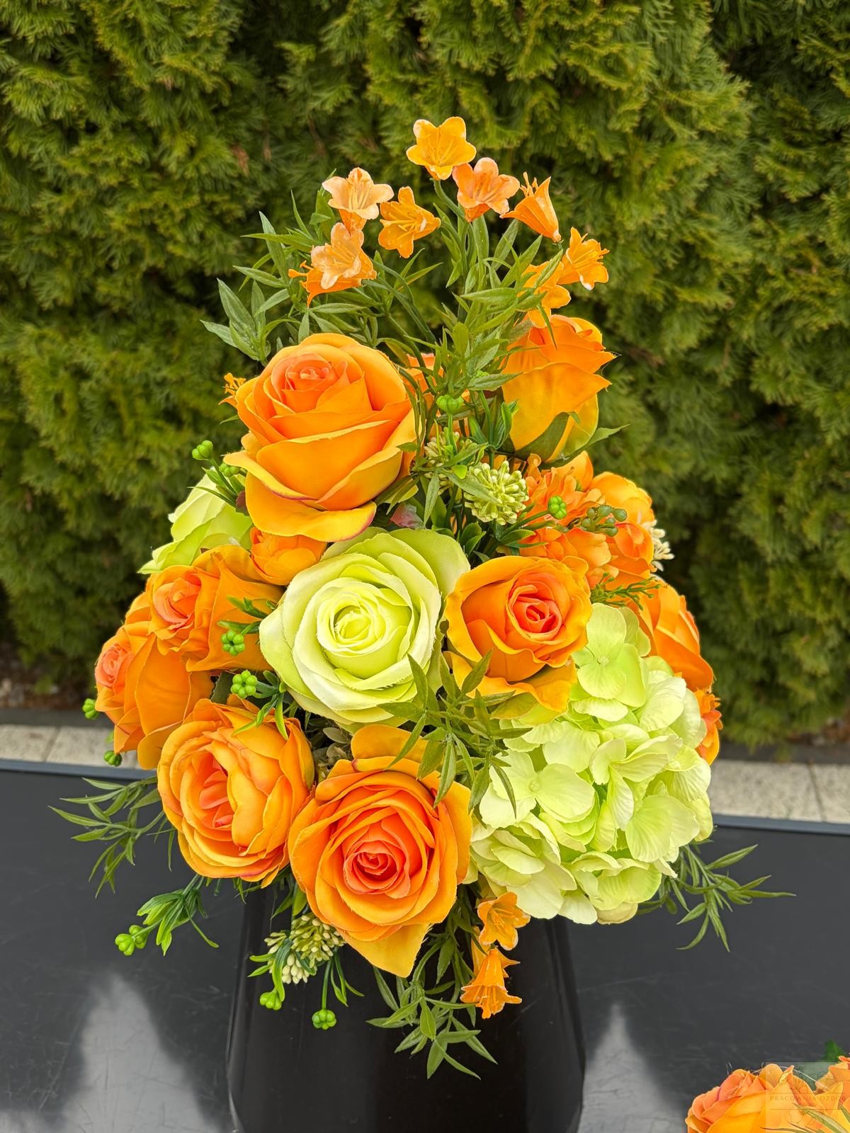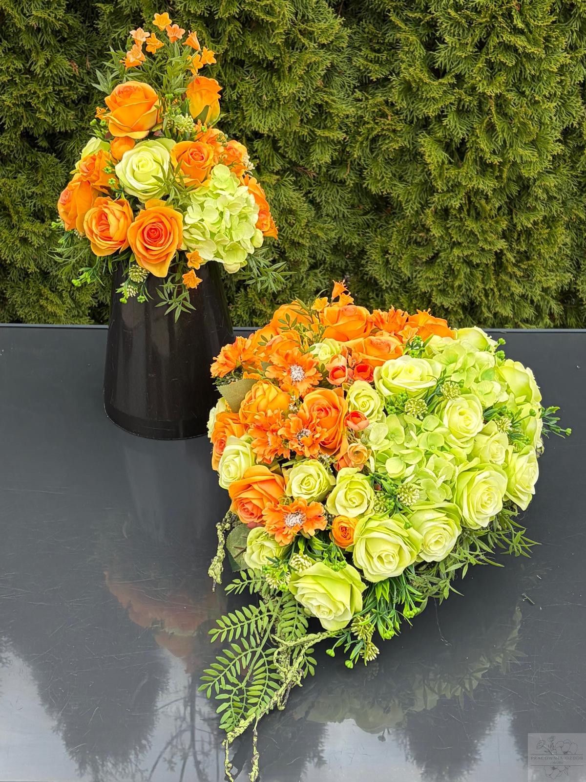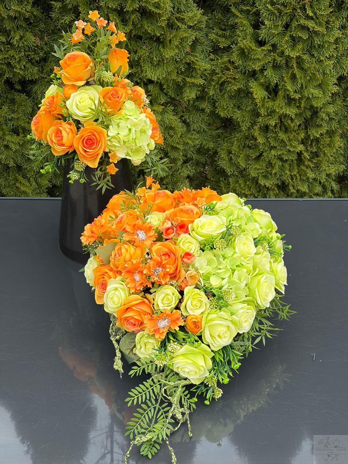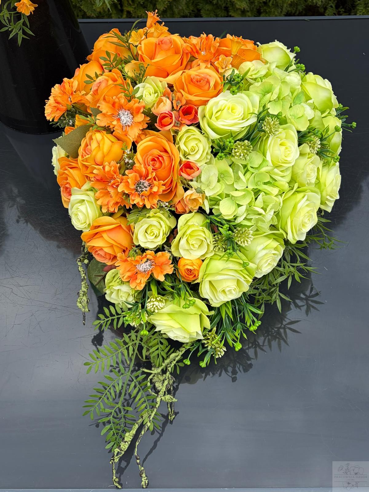 Efektowna kompozycja nagrobna wykonana na kształt serduszka z wysokiej jakości sztucznych kwiatów, utrzymana w szlachetnej kolorystyce mocnego pomarańczu i seledynie. Dominują klasyczne róże o pełnych, realistycznych kwiatach, uzupełnione delikatnymi pąkami oraz subtelnymi drobnymi kwiatami, które nadają całości lekkości i elegancji. Starannie dobrana zieleń podkreśla naturalny charakter aranżacji i dodaje jej głębi.