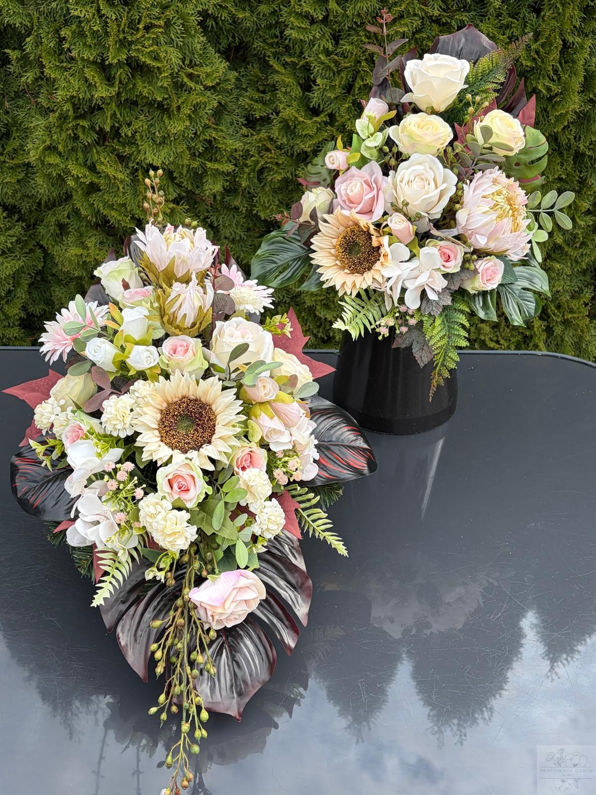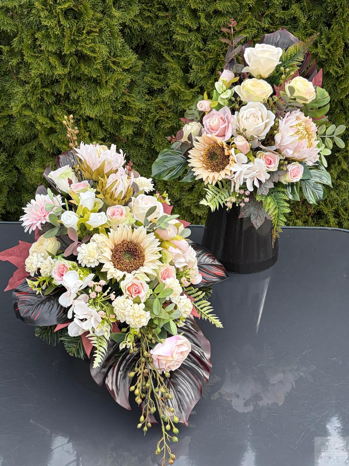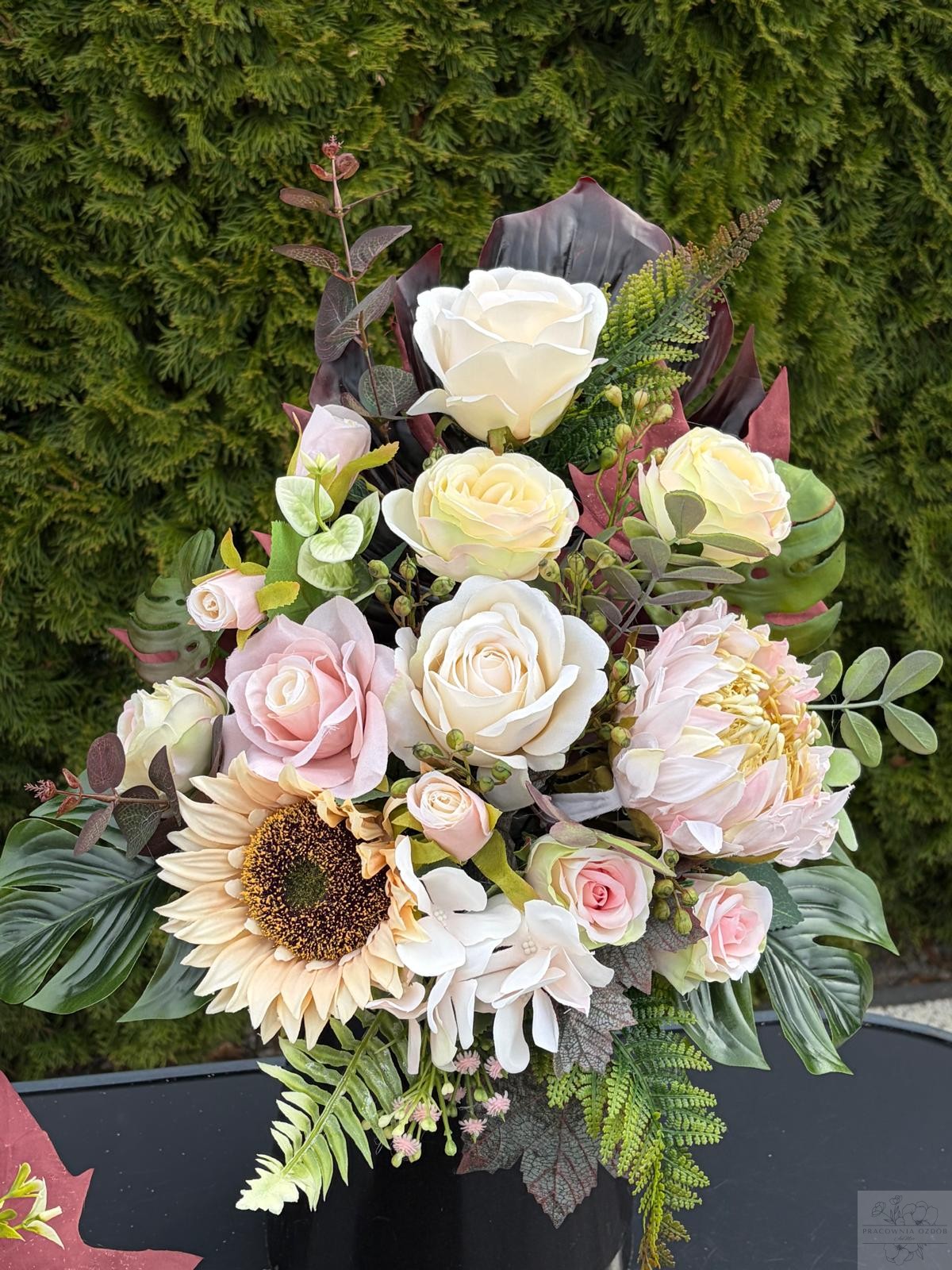 Kompozycja została wykonana z wysokiej jakości kwiatów sztucznych. Stabilna baza zapewnia wygodne ustawienie na nagrobku.