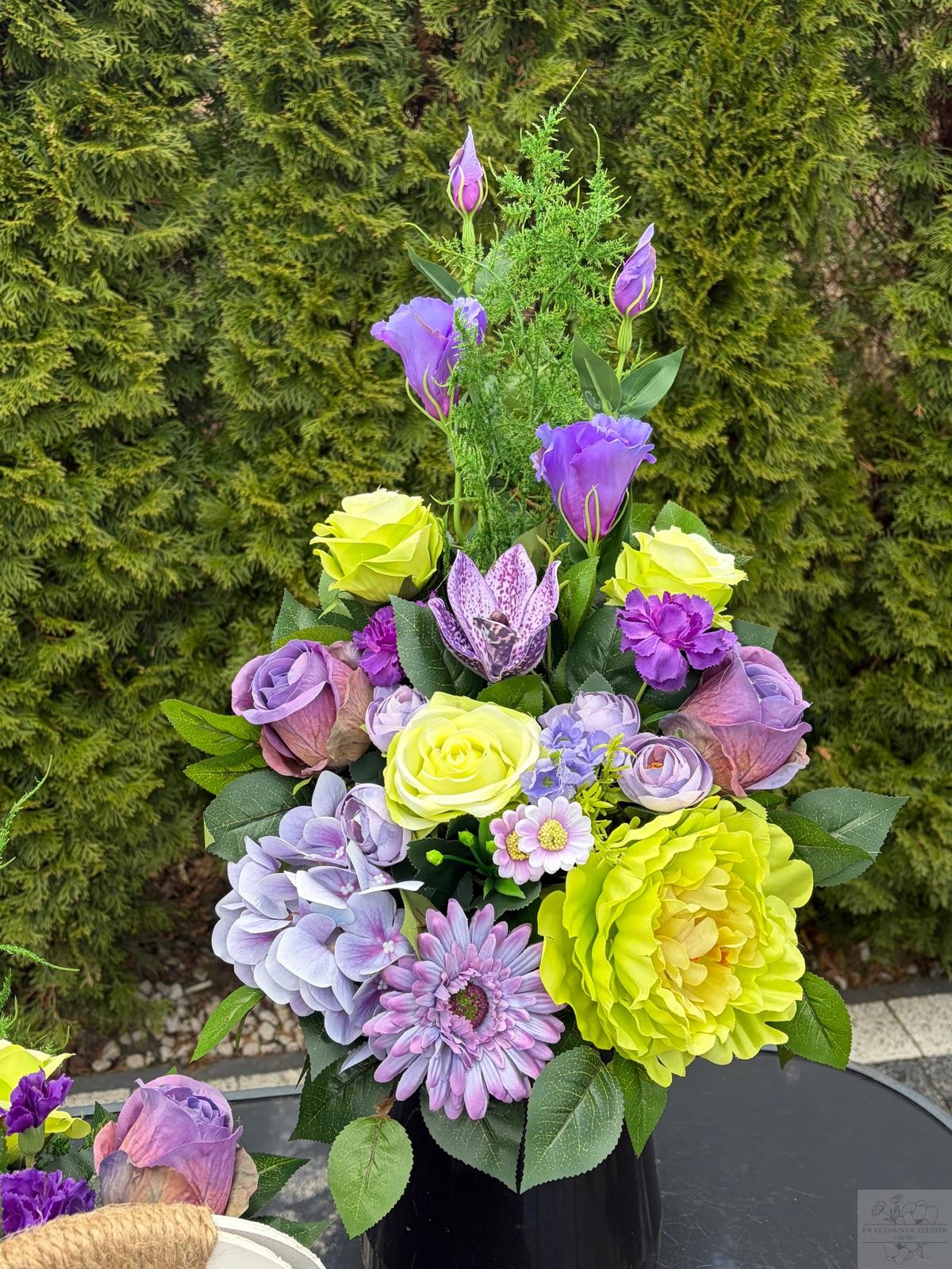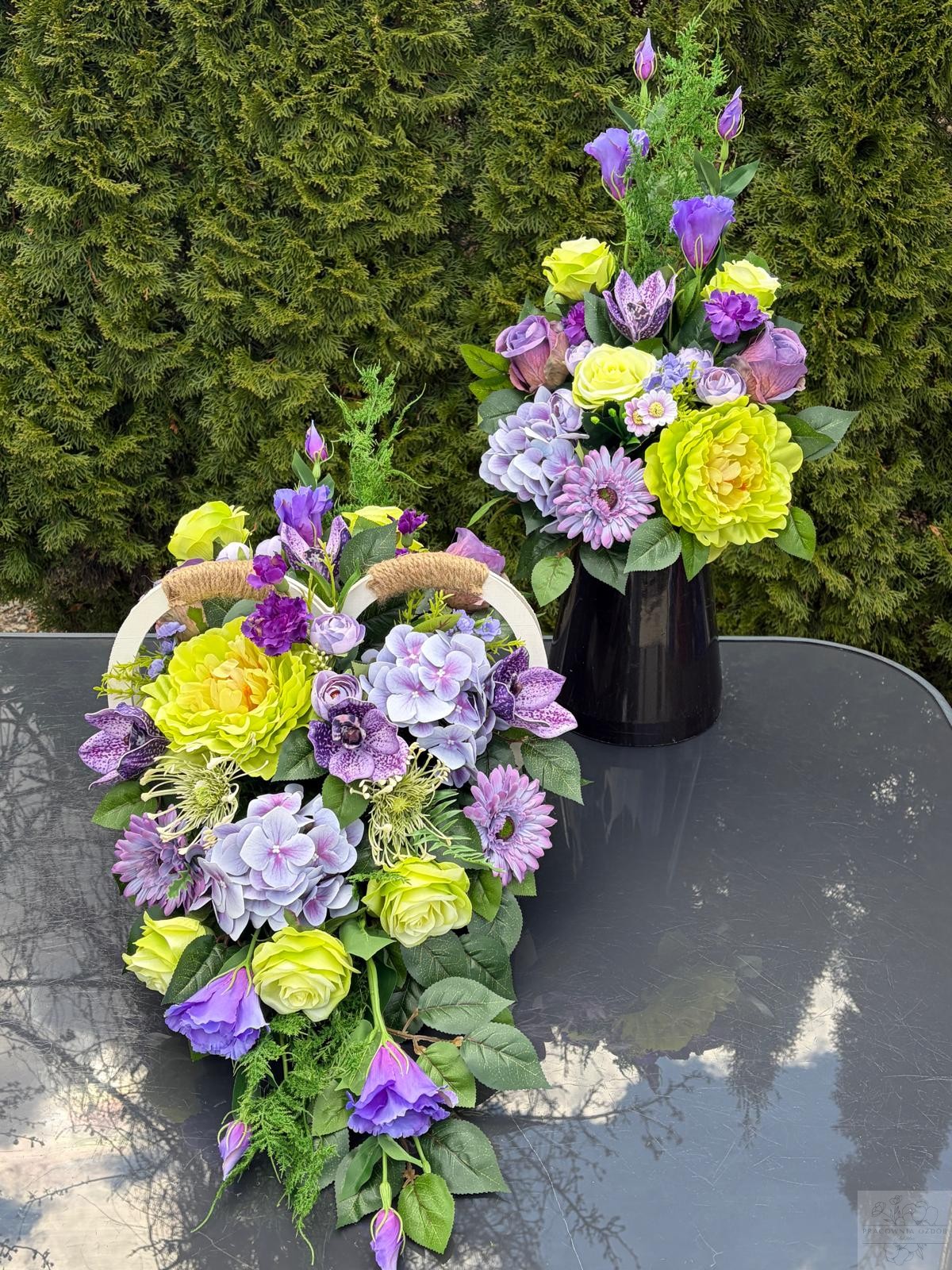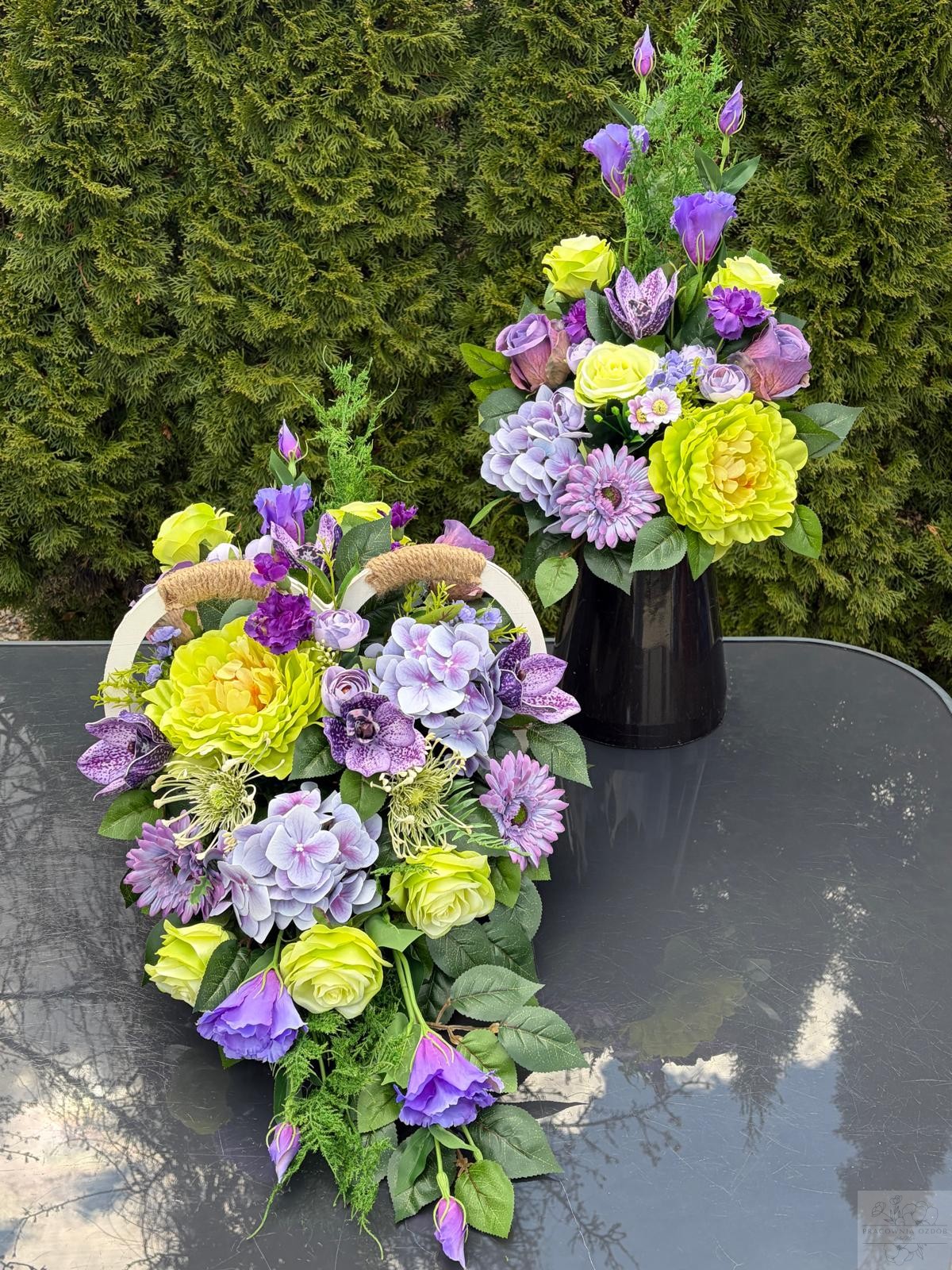 Wyjątkowa, ręcznie wykonana kompozycja nagrobna, która łączy w sobie subtelną elegancję i ponadczasowy charakter. Starannie dobrane kwiaty w odcieniach seledynu i fioletu, pięknie kontrastują z głęboką zielenią liści, tworząc harmonijną i spokojną całość.