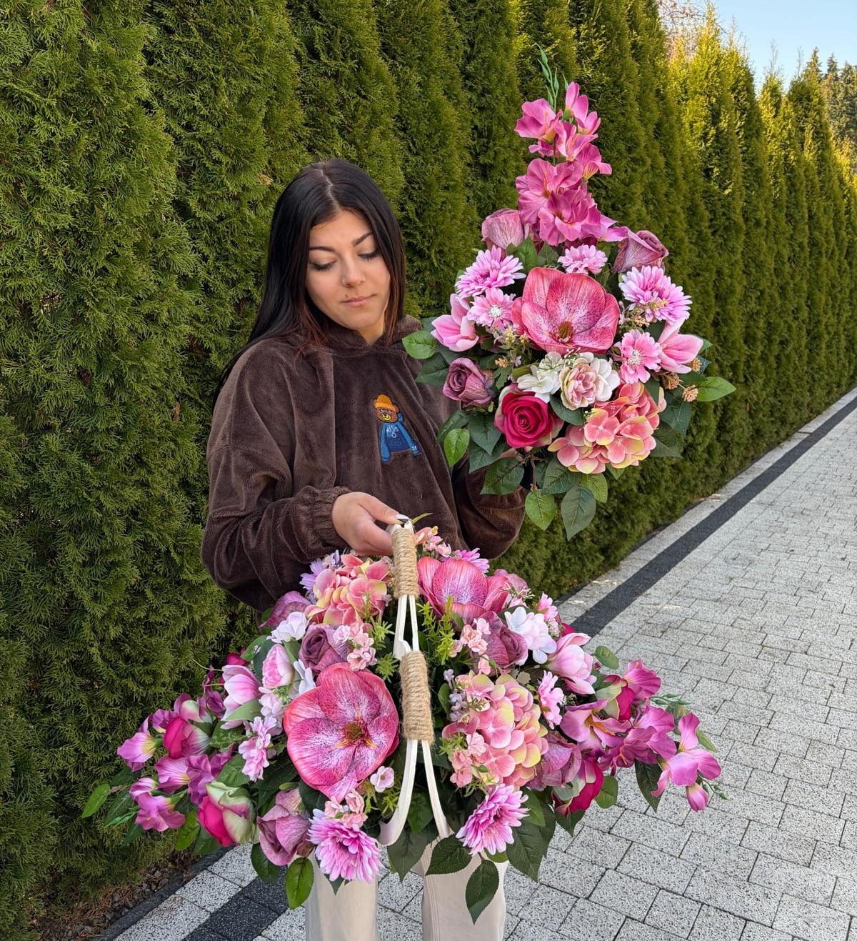 Wyjątkowa, ręcznie wykonana kompozycja nagrobna, która łączy w sobie subtelną elegancję i ponadczasowy charakter. Starannie dobrane kwiaty w odcieniach delikatnej bieli i szarościach, pięknie kontrastują z głęboką zielenią liści, tworząc harmonijną i spokojną całość.