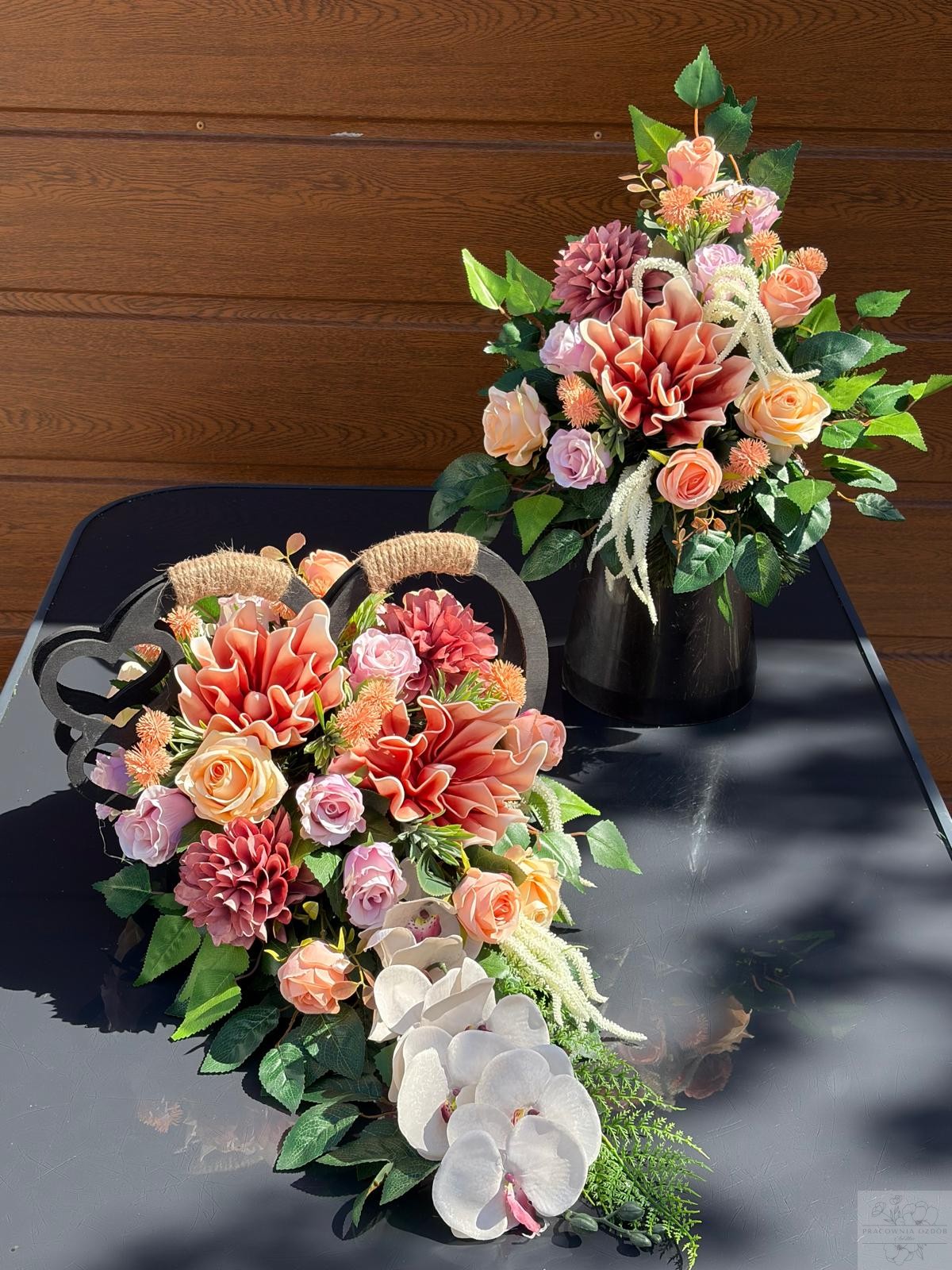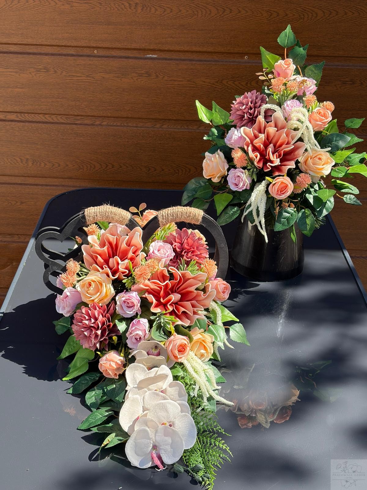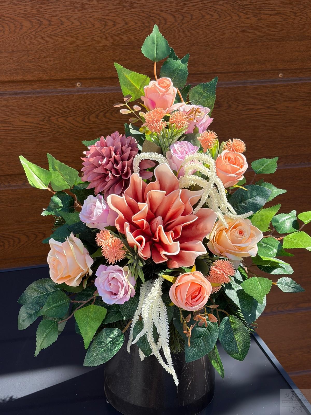 Wyjątkowa, ręcznie wykonana kompozycja nagrobna, która łączy w sobie subtelną elegancję i ponadczasowy charakter. Starannie dobrane kwiaty w odcieniach brązu i różu, pięknie kontrastują z głęboką zielenią liści, tworząc harmonijną i spokojną całość.