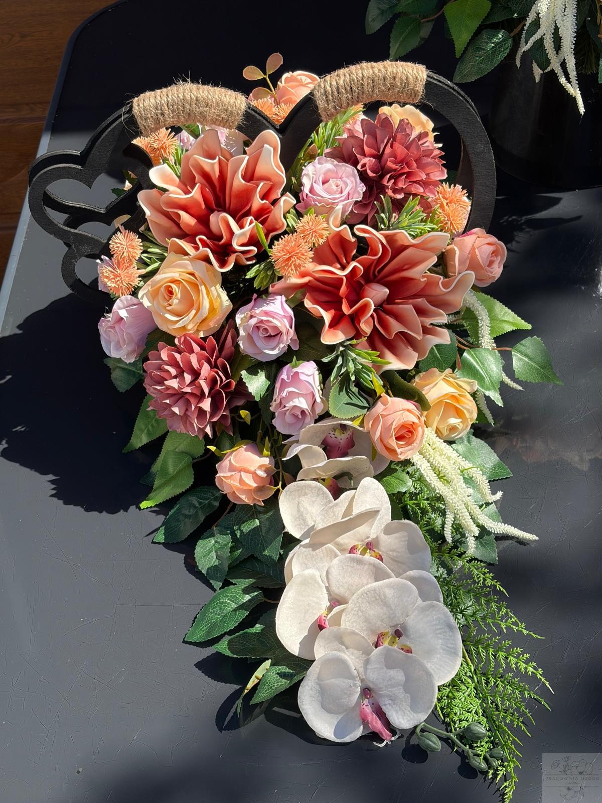 Kompozycja została ułożona na solidnej, trwałej bazie, w kształcie serca. Naturalny uchwyt ułatwia przenoszenie i ustawienie na pomniku. Idealna jako całoroczna dekoracja nagrobna.