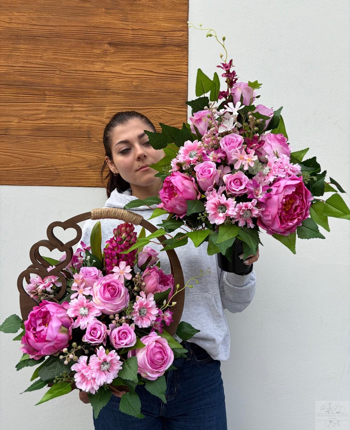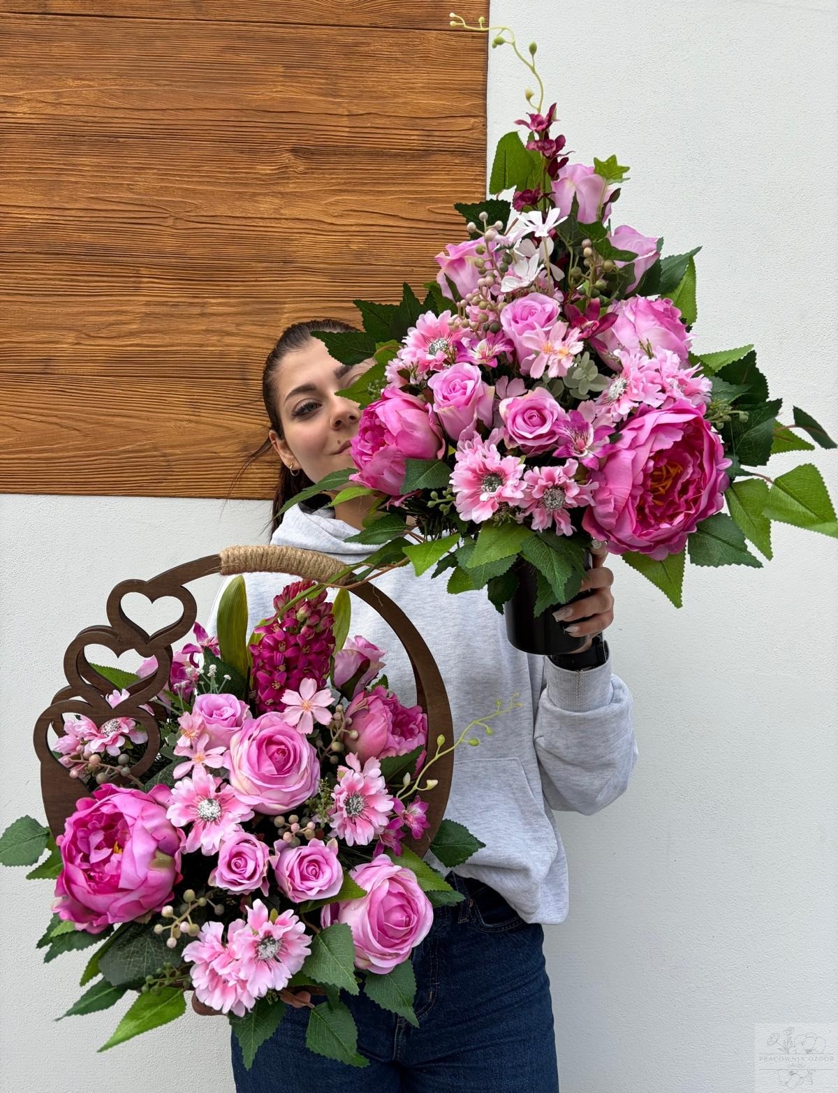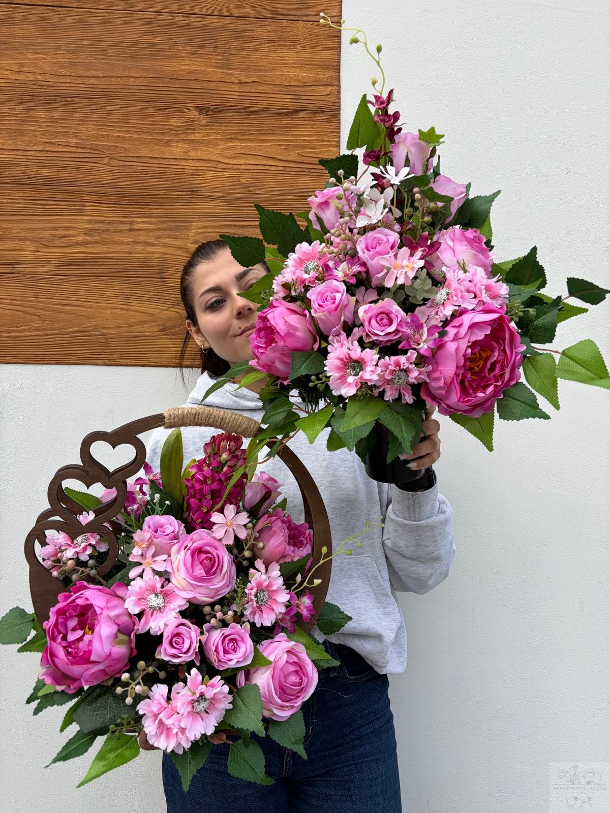 Zestaw: Kompozycja w ozdobnym koszu + bukiet w różu