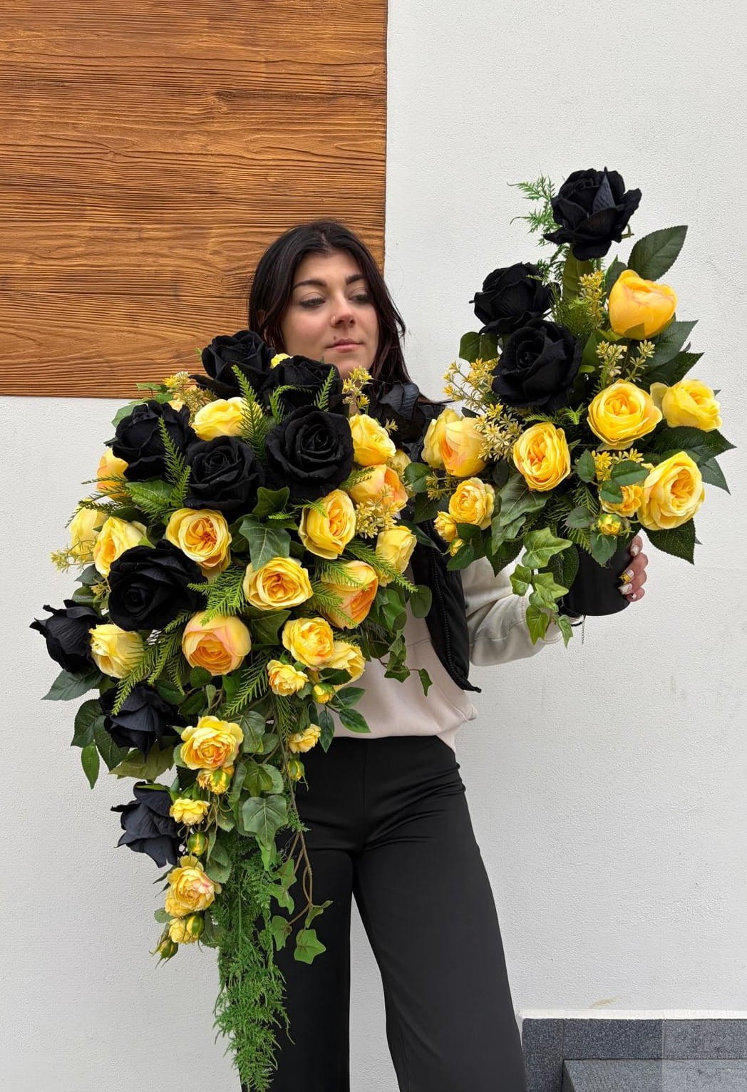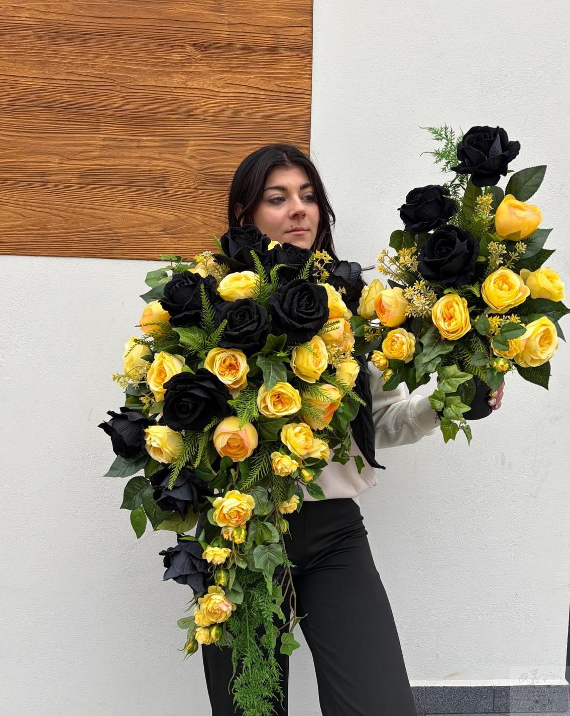 Głównym elementem dekoracji są starannie dobrane czarne oraz żółte róże, które symbolizują pamięć, szacunek oraz światło i nadzieję. Całość uzupełniona jest wysokiej jakości zielenią dekoracyjną, nadającą kompozycji naturalnego i harmonijnego charakteru.