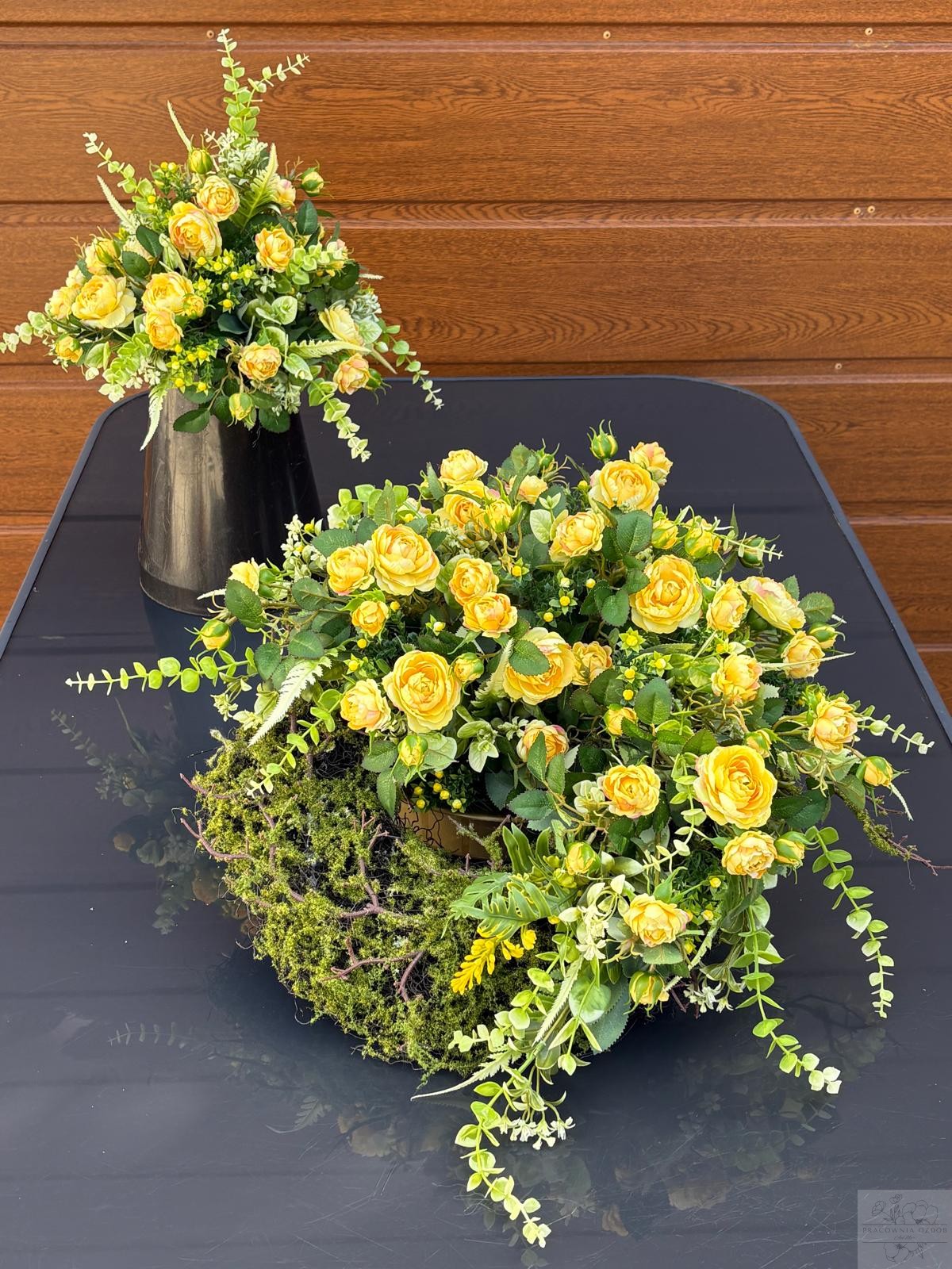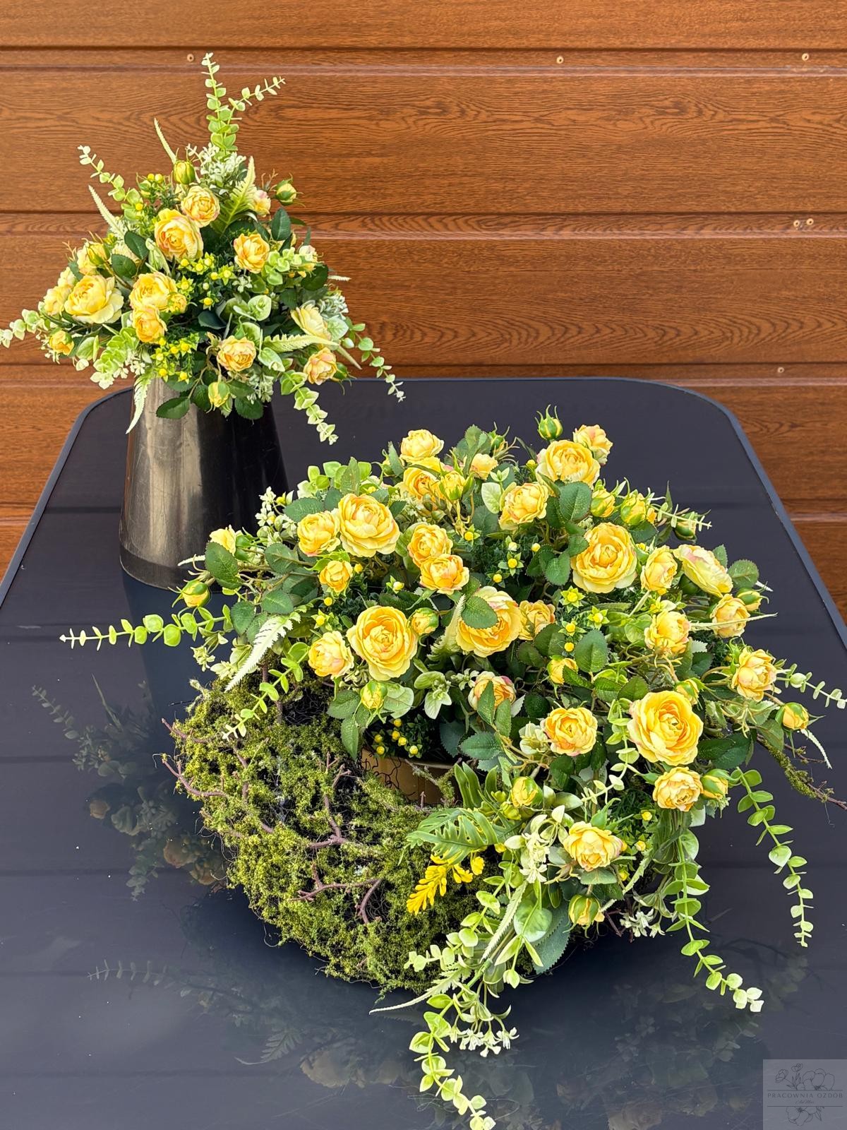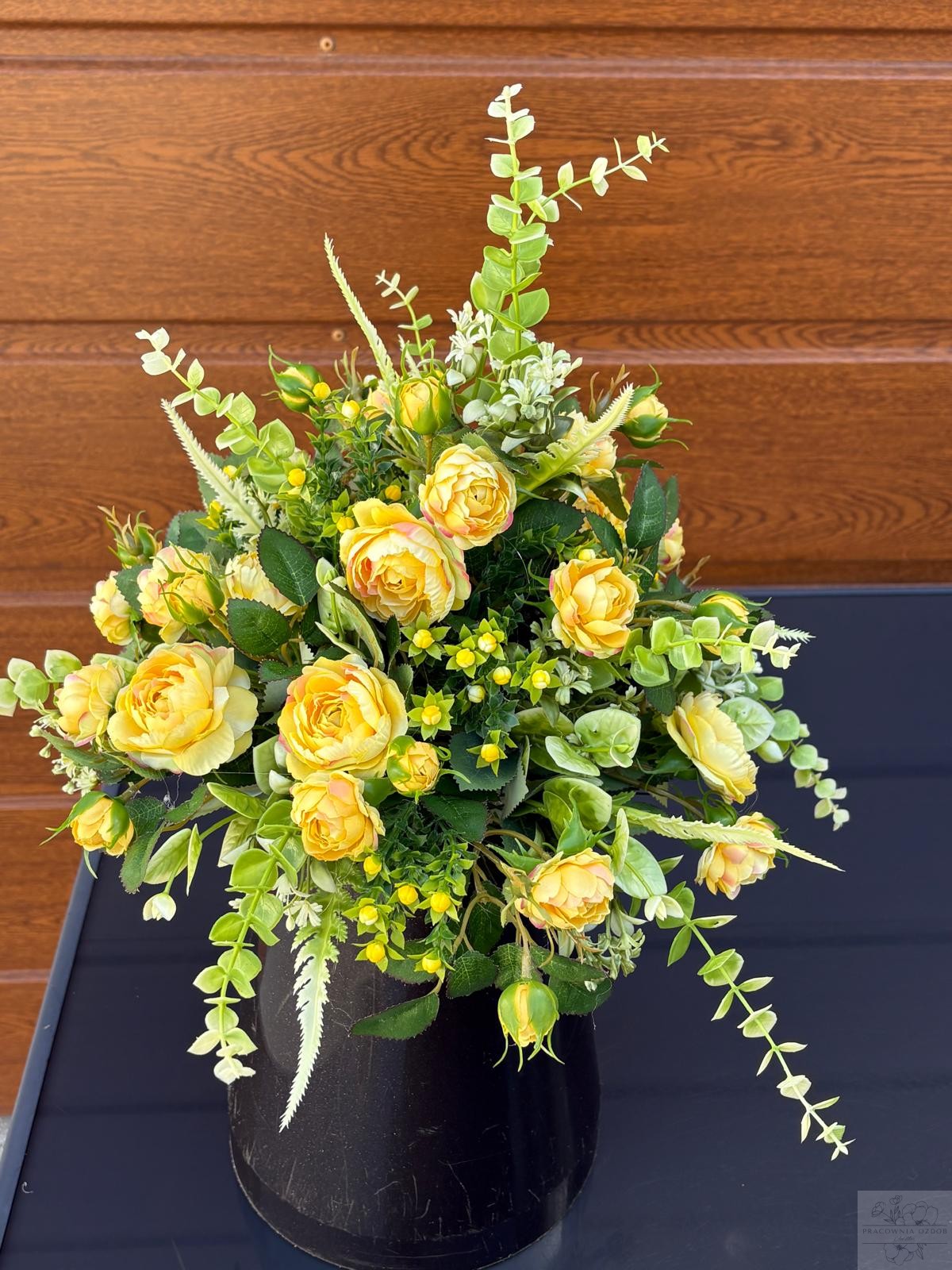 Dekoracja składa się z harmonijnie dobranych kwiatów w żółtej kolorystyce, uzupełnionych zielonymi dodatkami, które nadają całości świeży i subtelny wygląd.