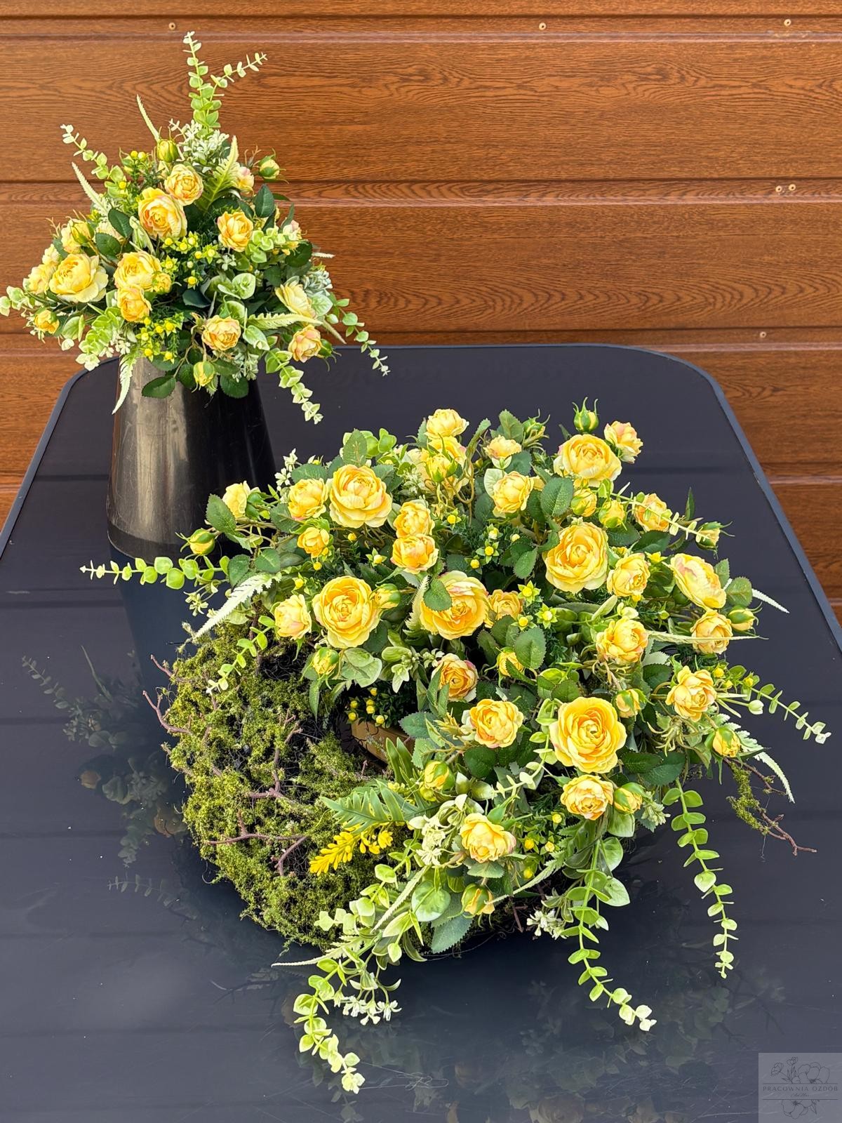 Elegancka kompozycja nagrobna wykonana z wysokiej jakości materiałów, zaprojektowana z myślą o trwałości i estetyce przez cały rok.
